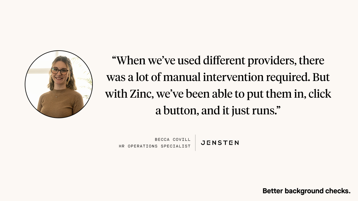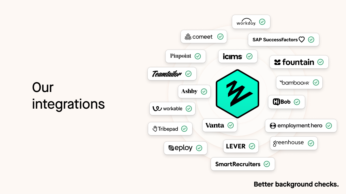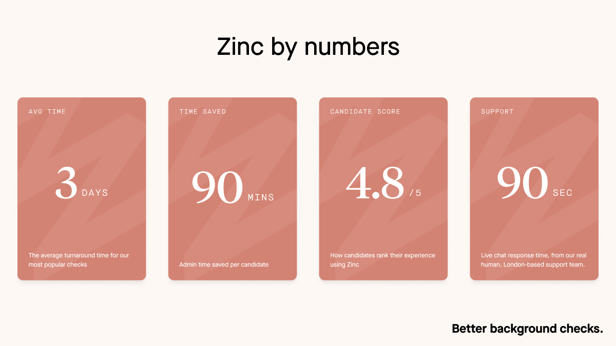 La plateforme tout-en-un de Zinc simplifie la personnalisation des vérifications, leur envoi aux candidats et la réception des résultats directement dans votre SIRH ou ATS. Nous sommes là pour transformer le mauvais en brillant, vous faisant gagner du temps et améliorant l'expérience des candidats.