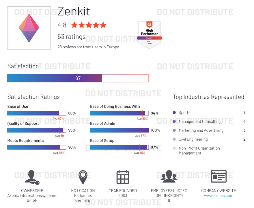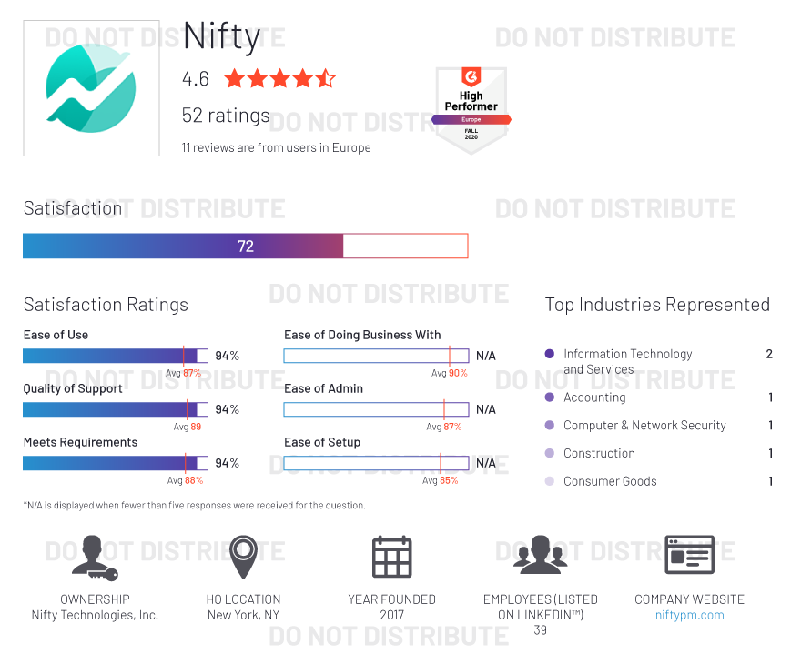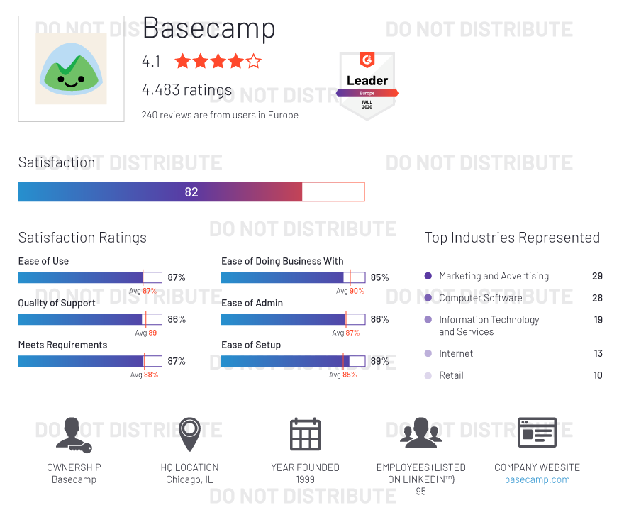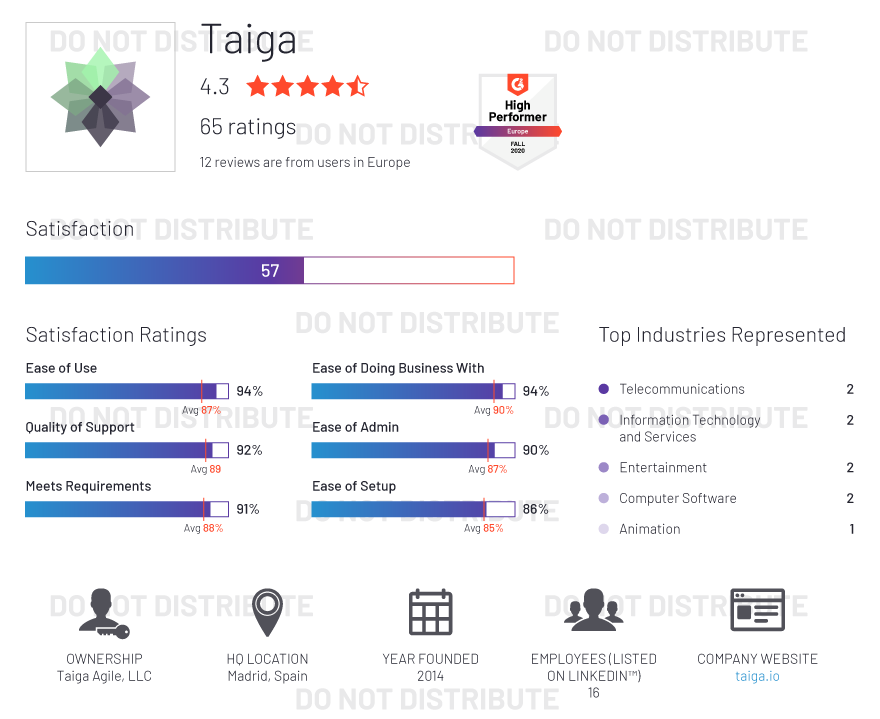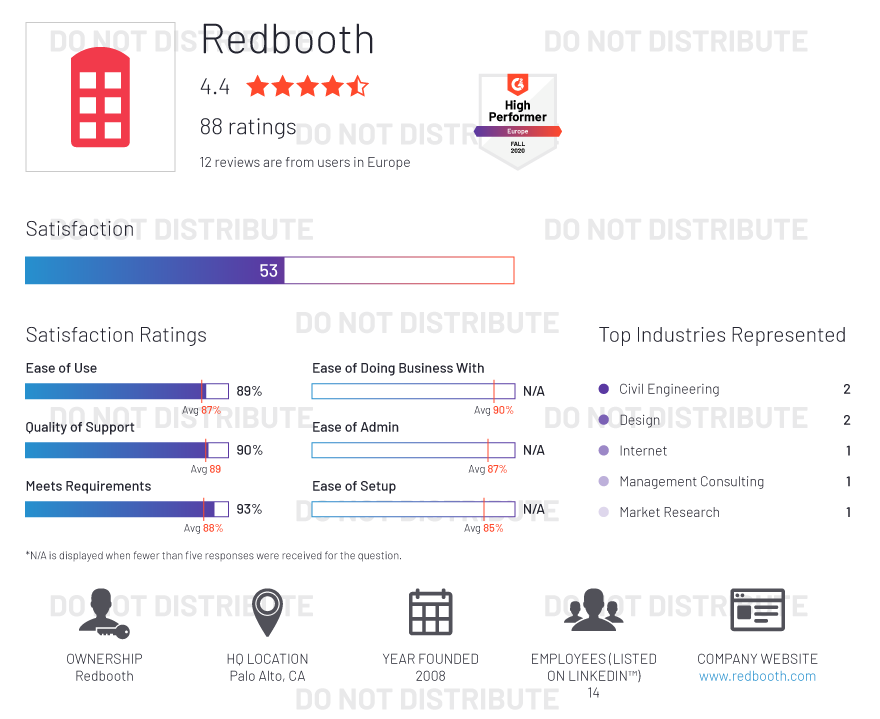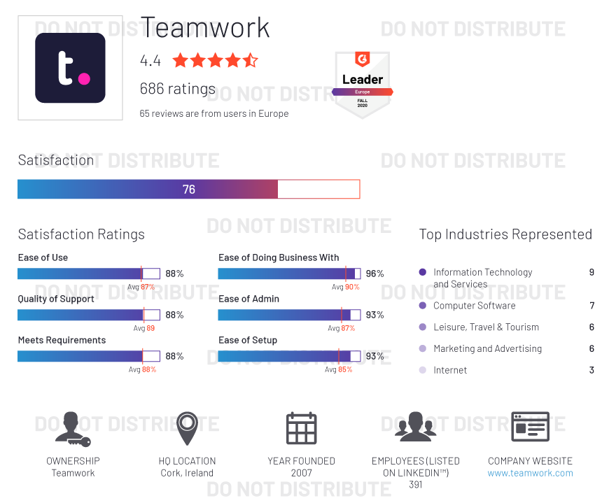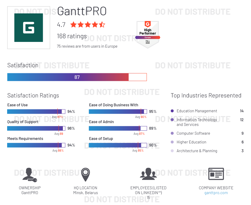 G2 rates products and vendors based on reviews gathered from our user community, as well as data aggregated from online sources and social networks. We apply unique algorithms (v4.0) to this data to calculate the Satisfaction and Market Presence scores in real time. The Europe Regional Grid® Report for Project Management | Fall 2020 is based on scores calculated using G2 algorithms v4.0 from reviews collected through September 2, 2020.