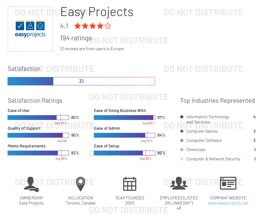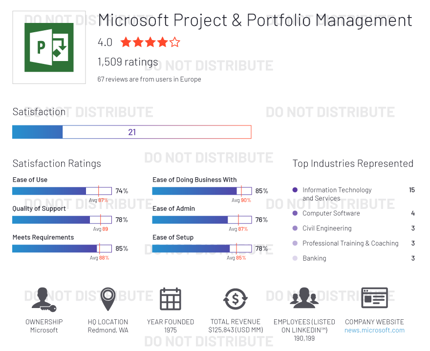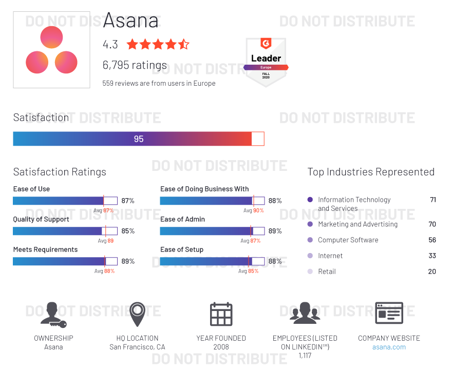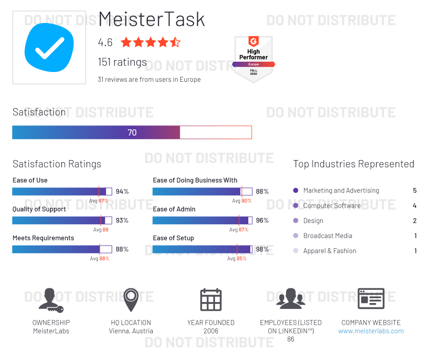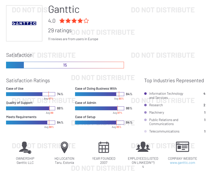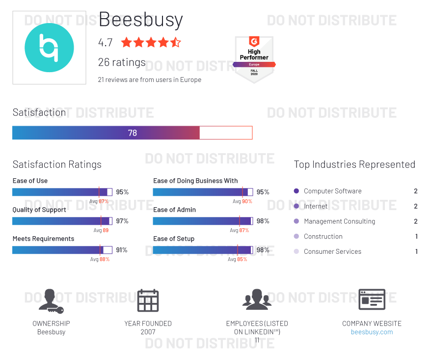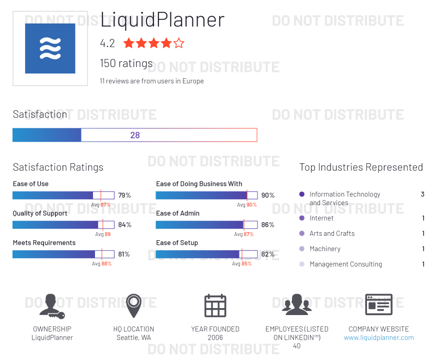 G2 rates products and vendors based on reviews gathered from our user community, as well as data aggregated from online sources and social networks. We apply unique algorithms (v4.0) to this data to calculate the Satisfaction and Market Presence scores in real time. The Europe Regional Grid® Report for Project Management | Fall 2020 is based on scores calculated using G2 algorithms v4.0 from reviews collected through September 2, 2020.