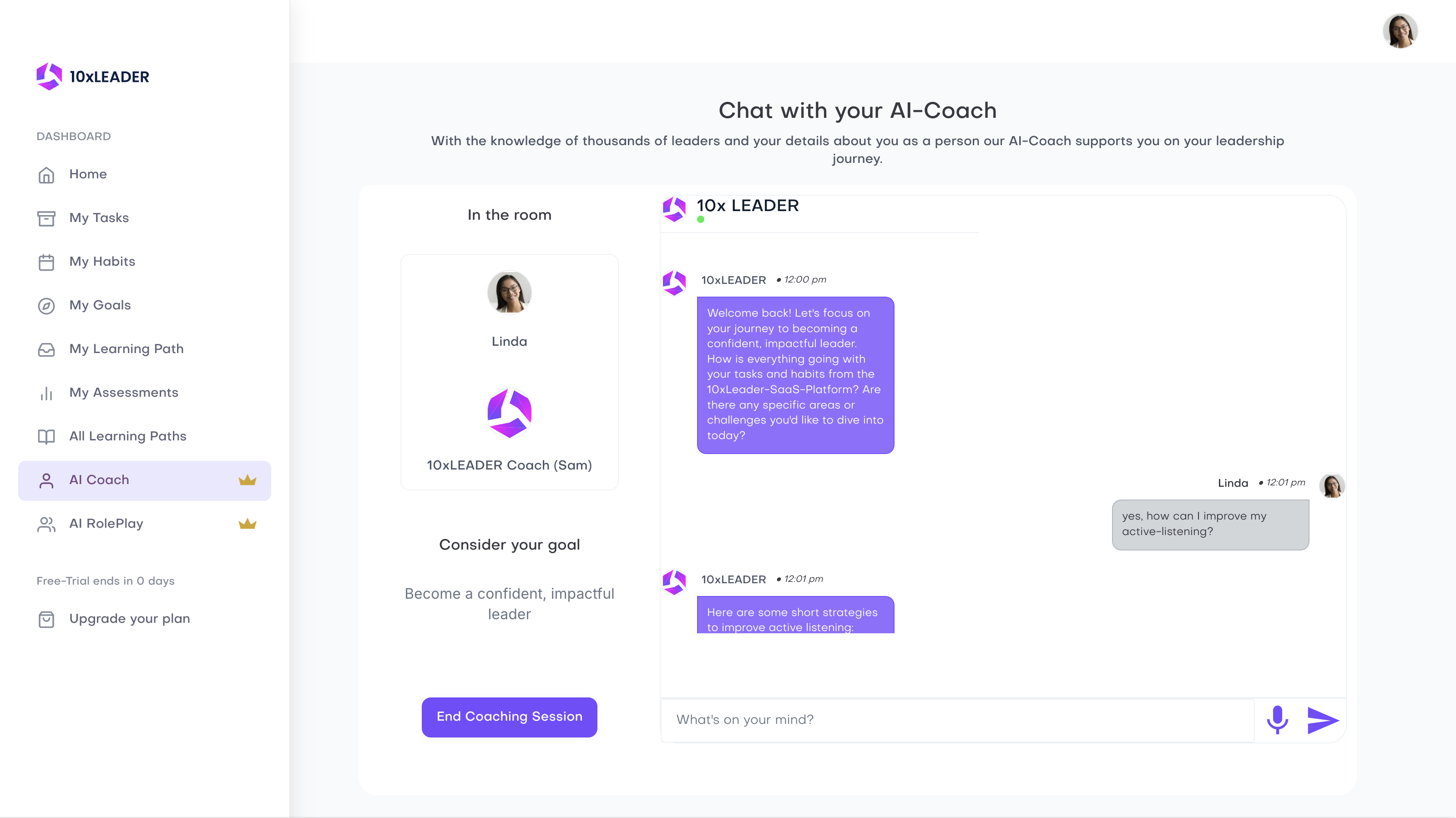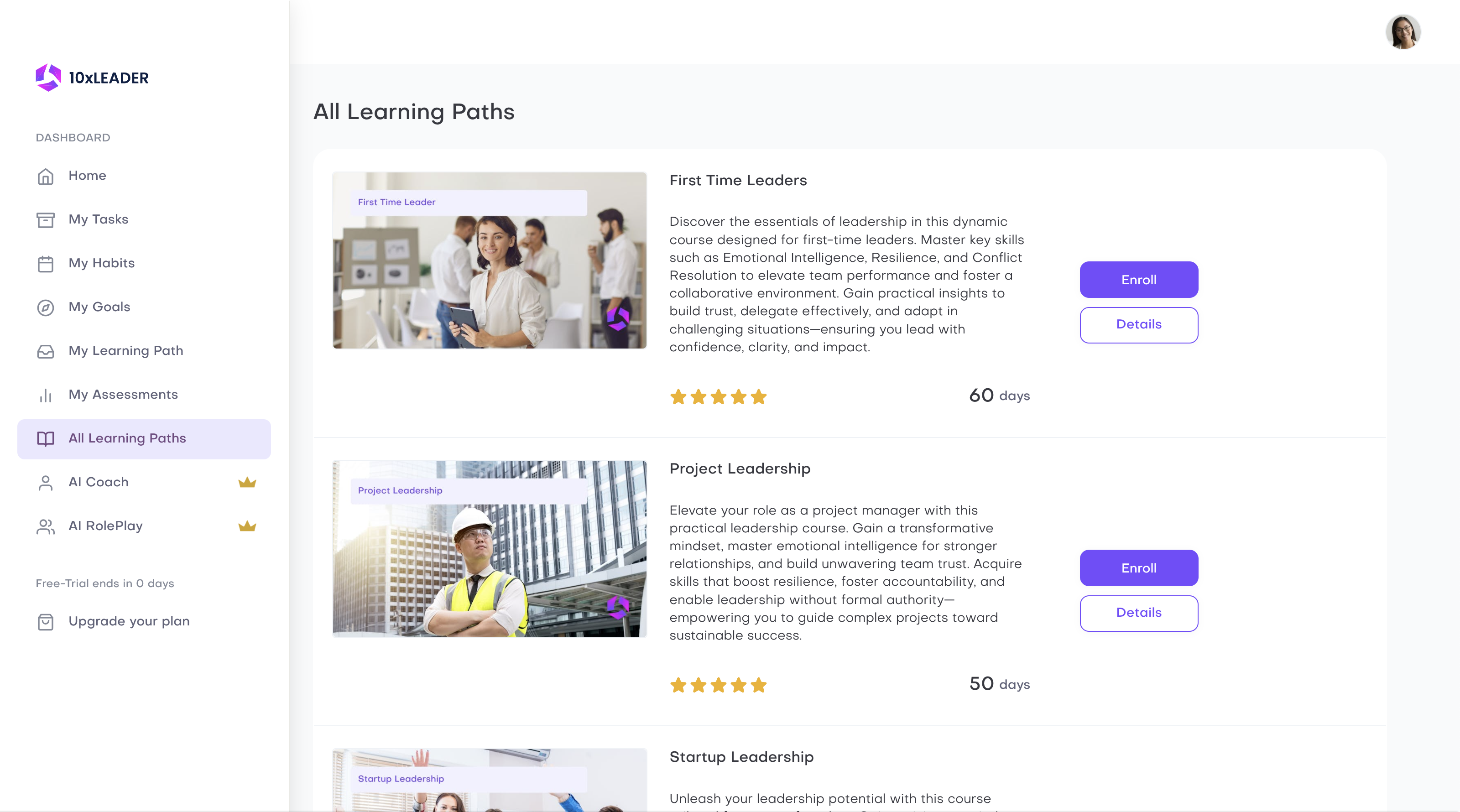 facile da usare, percorsi di apprendimento chiaramente definiti, ho trovato immediatamente IL MIO percorso di apprendimento; 10xLEADER ha adattato il mio percorso di apprendimento in modo che dovessi imparare ciò che non so; le funzioni AI sono semplicemente fantastiche. Ho provato molto la funzione di gioco di ruolo AI. Sembra molto naturale come se parlassi con un dipendente seduto di fronte a te nella vita reale. Recensione raccolta e ospitata su G2.com.