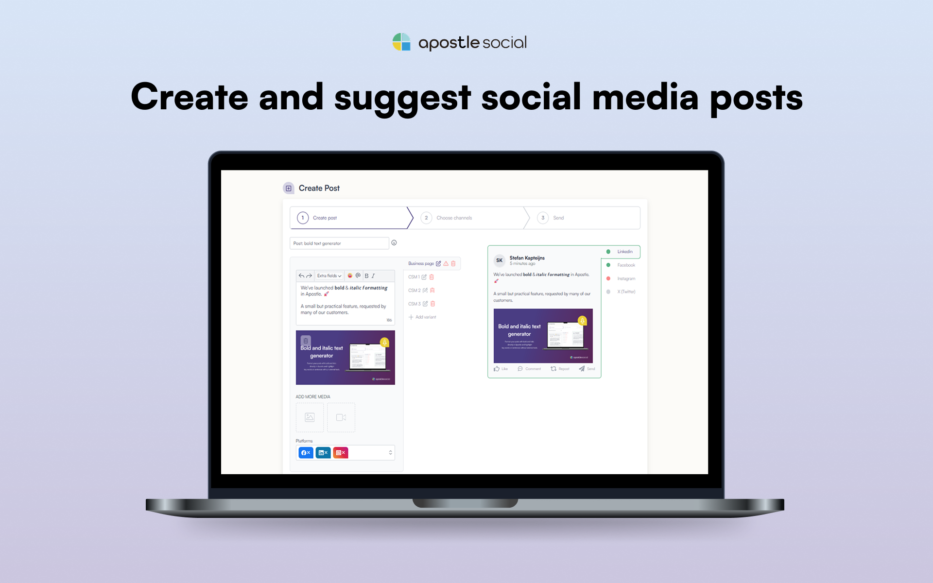 I find Apostle very user-friendly and appreciate the insights it offers into real reach numbers on my colleagues' accounts. The support team is really quick and very helpful whenever I need assistance. The implementation program greatly helped drive our adoption, and I can schedule content for our entire team quickly, which helps them become more active on social media. It's perfect to see how well the posts perform on colleagues' accounts. Apostle helps us get real insights into how valuable our employees are with their personal accounts. The ability to schedule content within minutes and having colleagues approve suggested content within seconds is fantastic. Additionally, ghostwriting for our management team boosts our reach and brand awareness. We've received great help from a dedicated customer success manager, and fully guided onboarding was beneficial in terms of driving adoption. Recensione raccolta e ospitata su G2.com.