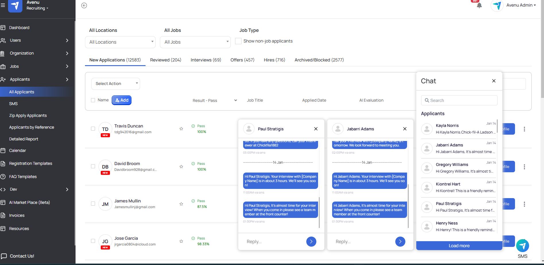 Avenu's SMS feature enables seamless communication with candidates directly from the platform. Send personalized messages, schedule updates, and receive responses in real time to keep applicants informed and engaged throughout the hiring process.