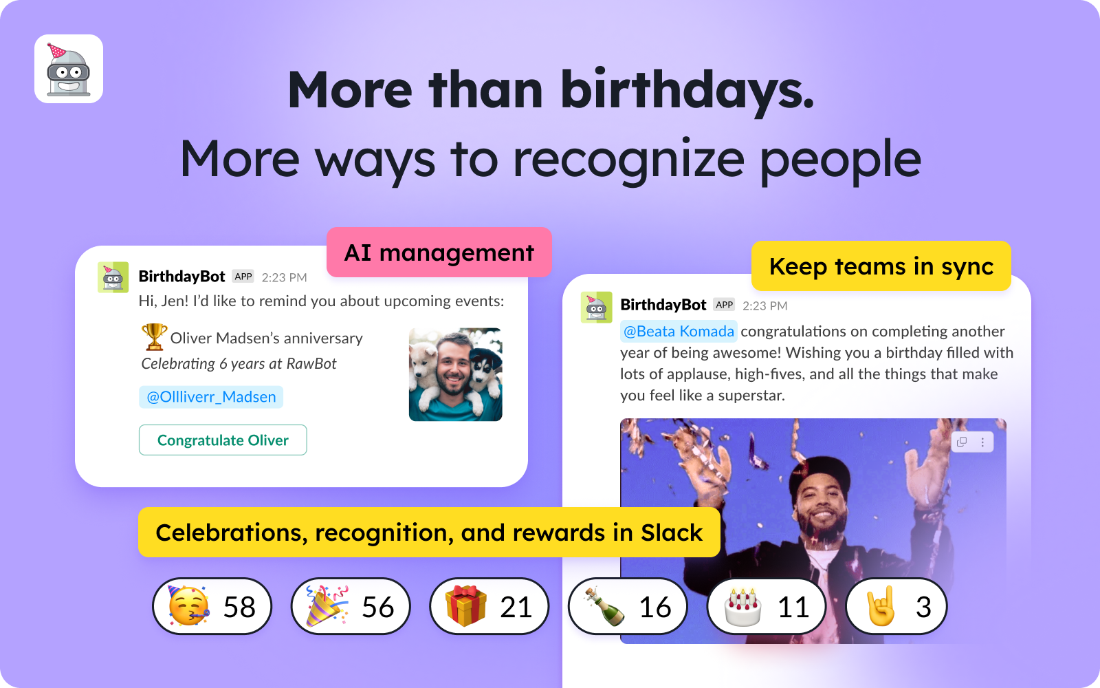 La mia cosa preferita di BirthdayBot è che puoi accedere e decidere se vuoi o meno che il tuo compleanno venga celebrato. Alcuni membri del personale non amano le celebrazioni pubbliche, e BirthdayBot permette loro di rimuovere i loro compleanni o di non impostarli affatto, il che significa che non verranno celebrati. Questa funzione mi permette di evitare di gestire la politica delle celebrazioni dei compleanni. Ho anche trovato la configurazione iniziale molto facile; l'ho semplicemente collegato, impostato la fatturazione e poi informato il mio team tramite Slack. Ha gestito automaticamente il resto della configurazione. Recensione raccolta e ospitata su G2.com.