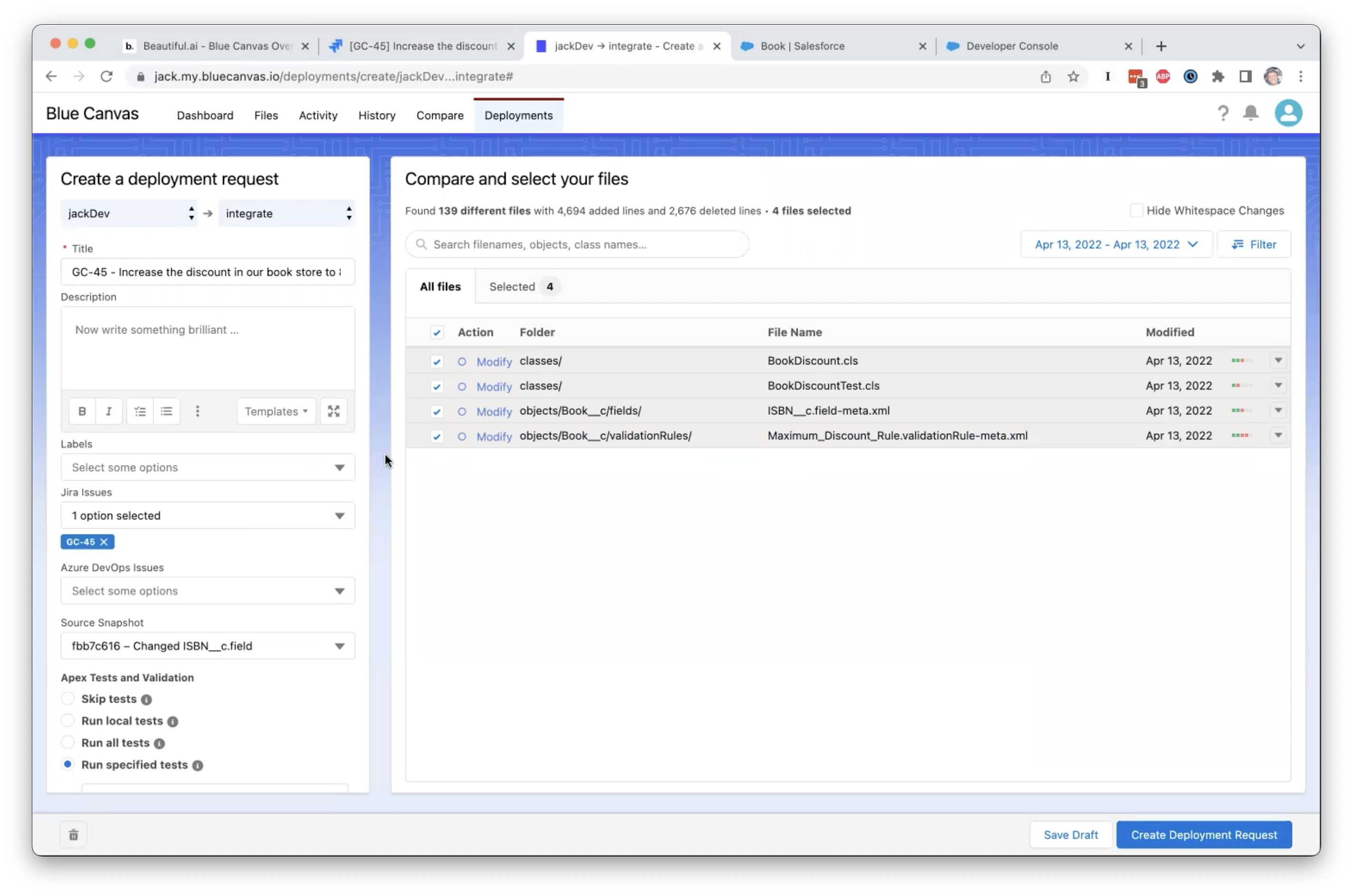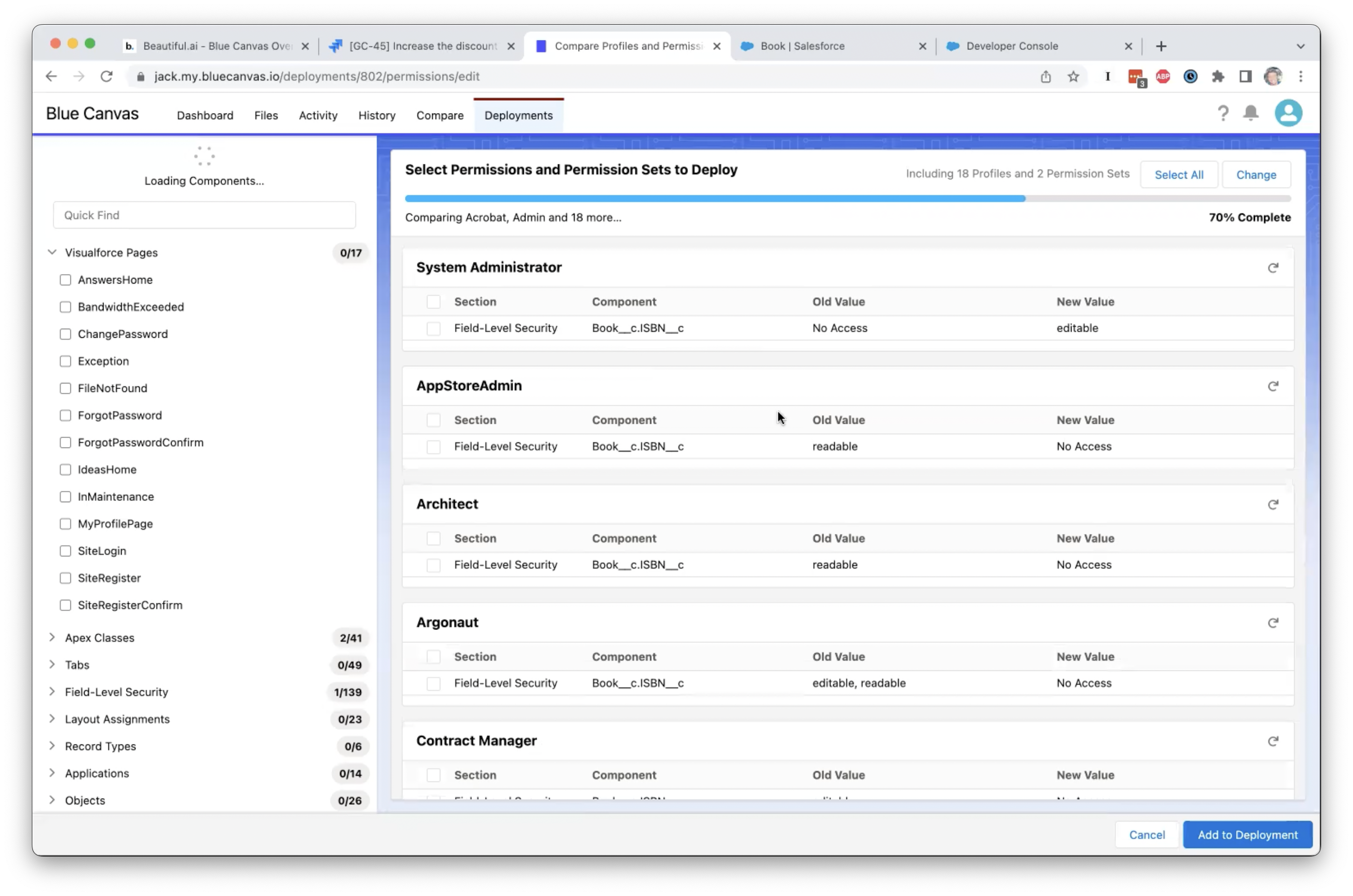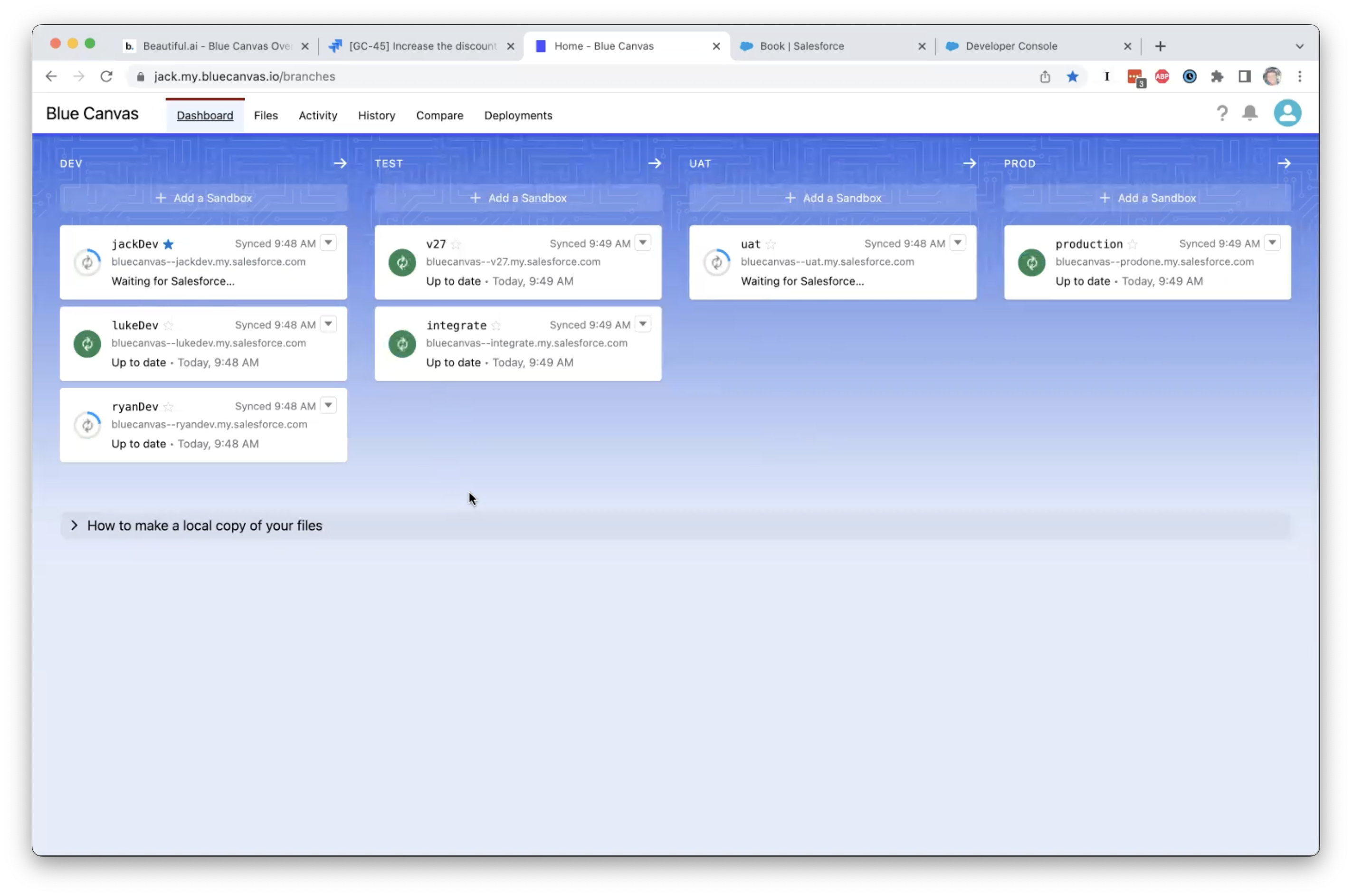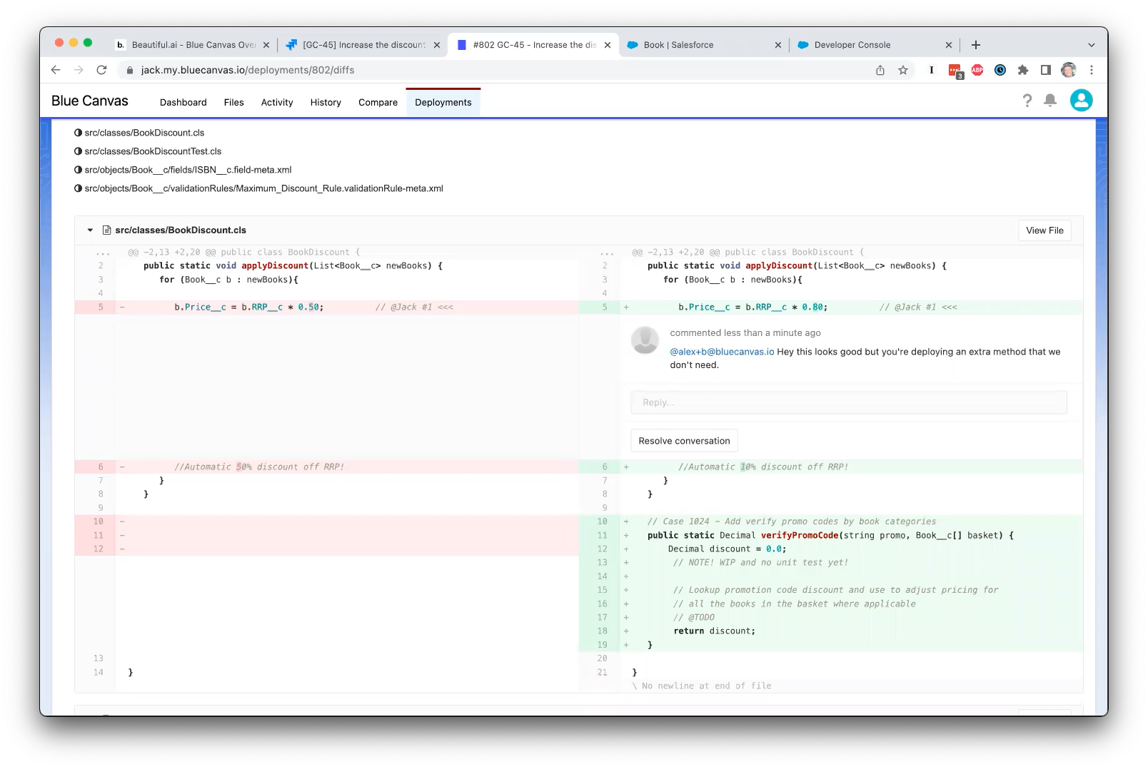 Mi sono imbattuto in Blue Canvas alla conferenza TDX e mi è stato mostrato quanto tempo si possa risparmiare bypassando i Change Sets. Solo questo è stato un grande vantaggio per i nostri team, ma abbiamo iniziato a utilizzare Blue Canvas per regolare e potenziare l'intero processo di audit e rilascio di SF. Ci volevano 20 giorni per completare un push in produzione. Ora lo facciamo in un paio d'ore. L'integrazione nativa con Jira per condividere le storie dei clienti è stata davvero fantastica. Questo ha significato che la reattività dell'intera organizzazione verso i clienti è migliorata rapidamente, e ci siamo resi conto che Salesforce è più come il cuore pulsante della nostra azienda, quindi poterlo utilizzare rapidamente, in sicurezza (e rimanere conformi agli audit) era fondamentale.