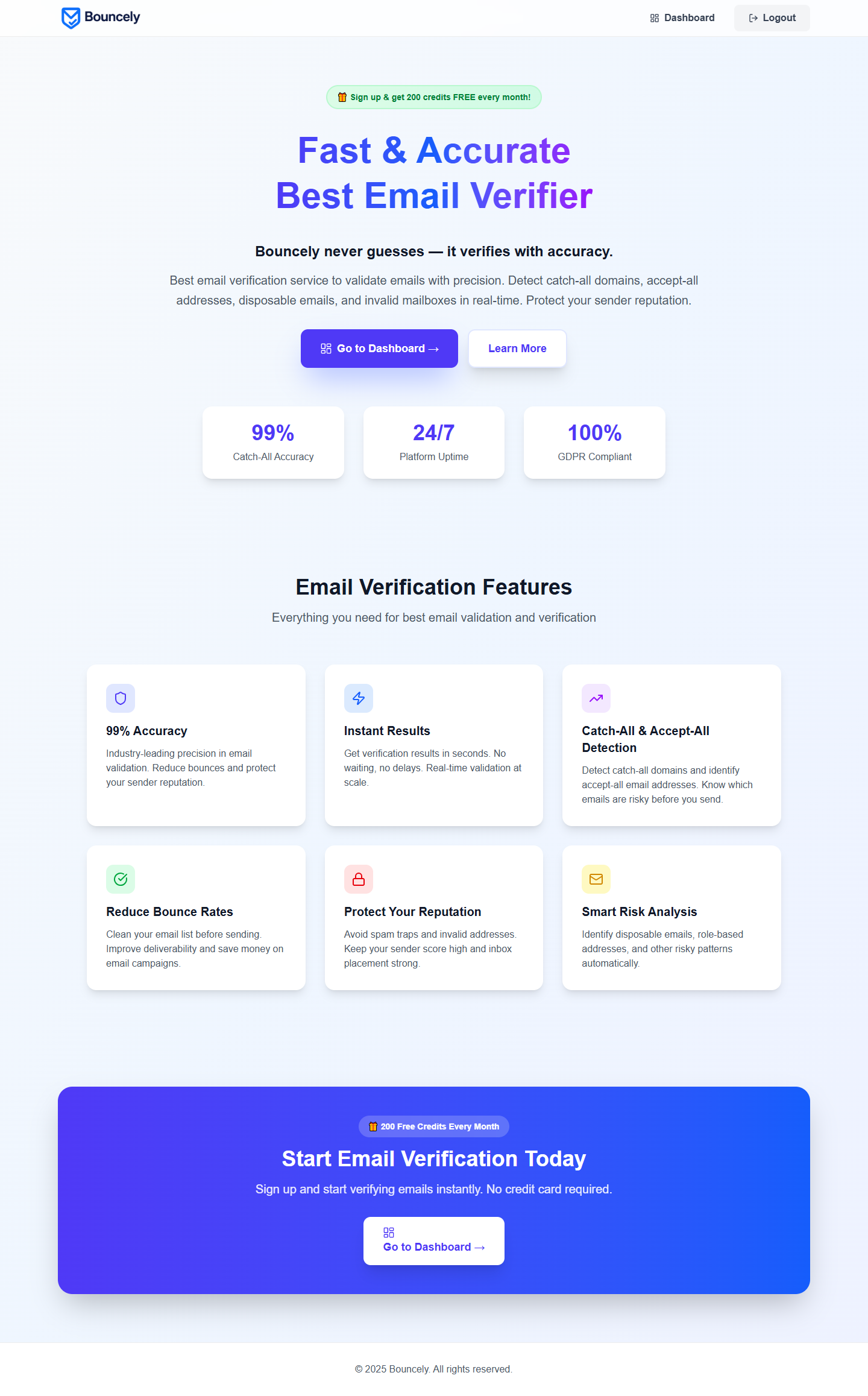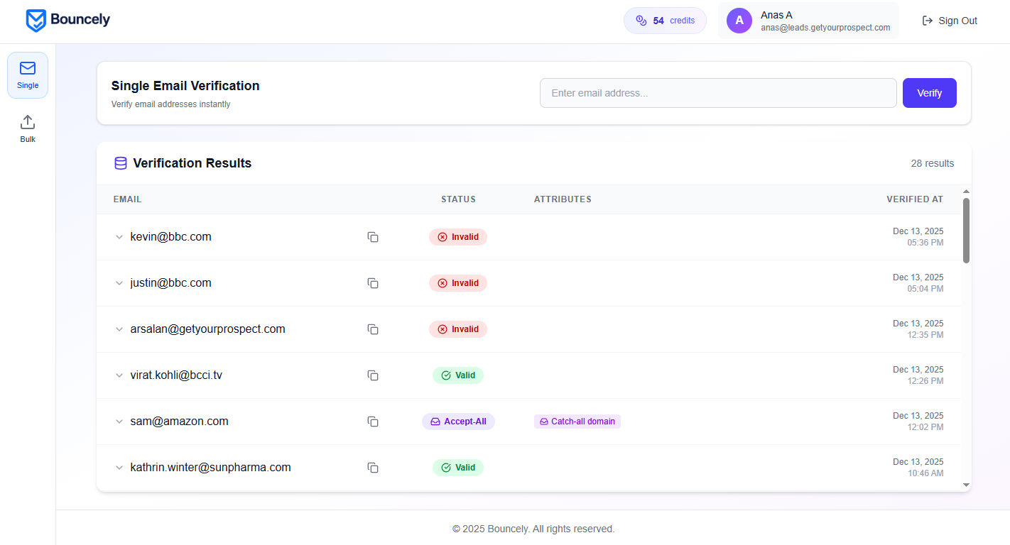 Verificare indirizzi email in blocco non è mai stato così facile. Lo strumento di verifica email di Reoon rende la verifica o la convalida della tua lista email estremamente semplice senza inviare alcuna email. Con il nostro sistema di verifica intelligente unico, ora puoi verificare gli indirizzi email che in passato erano quasi impossibili da verificare. Gmail, Email di Microsoft (cioè Outlook, Hotmail, Live, MSN, ecc.), Yahoo e quasi tutte le altre email di dominio personalizzato possono essere verificate senza alcun problema con il nostro verificatore di email. Le nostre analisi dettagliate ti mostreranno la condizione precisa di qualsiasi email. Il nostro sistema di rilevamento di email usa e getta aggiornato ti permetterà di rilevare gli indirizzi usa e getta più dinamici. Con il nostro sistema di convalida email unico, forniamo risultati con più del 99% di accuratezza.