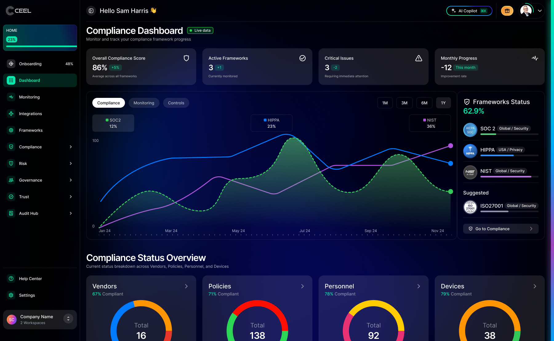 Ceel automatizza l'intero ciclo di vita della conformità attraverso copiloti IA agentici che gestiscono la raccolta delle prove, la mappatura dei controlli, il monitoraggio dei rischi e la prontezza agli audit. Gli utenti possono ottenere la conformità in giorni anziché mesi e gestire l'intera postura di conformità da un'unica piattaforma unificata.