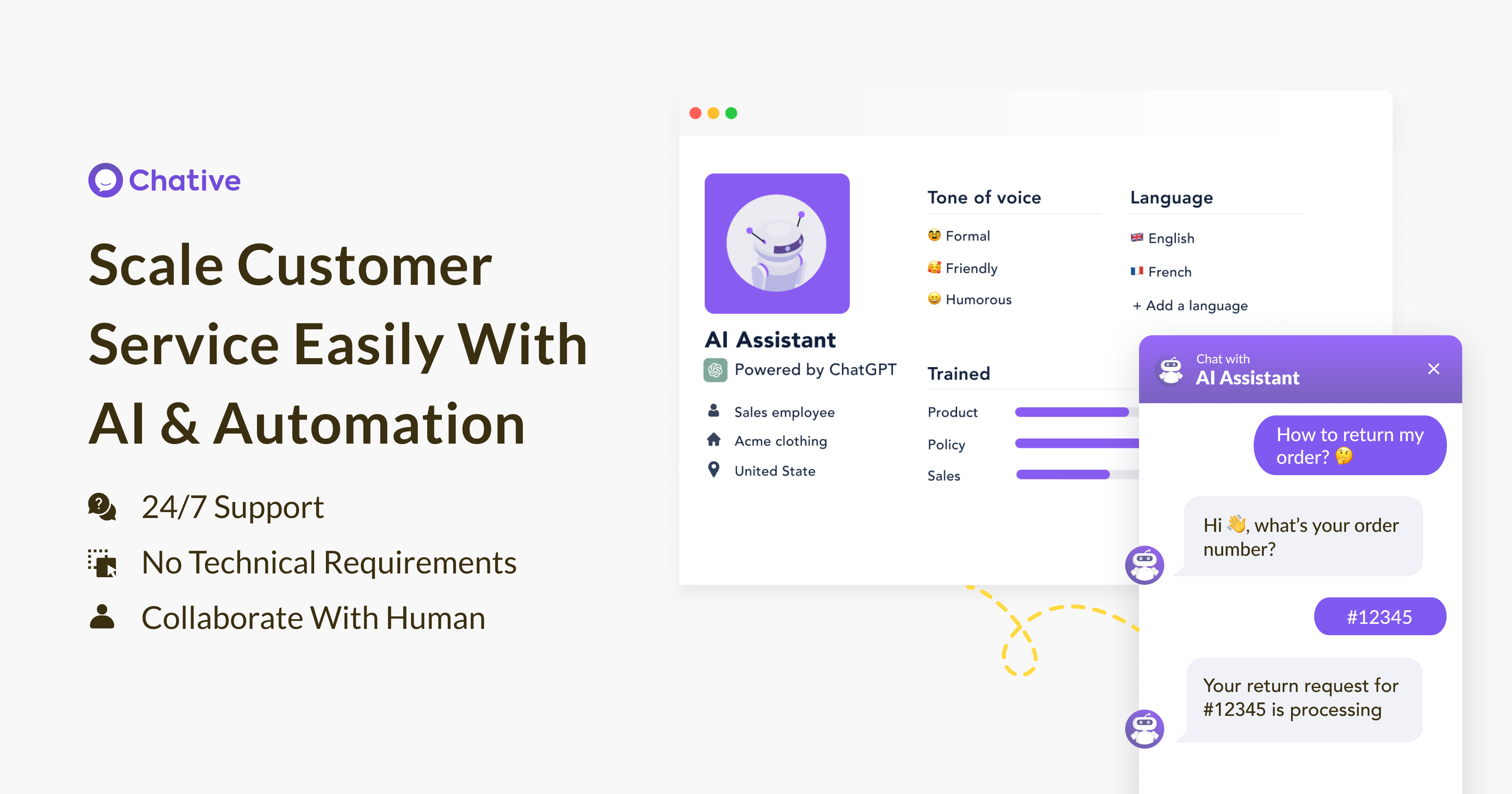 - Chative ha una soluzione di servizio clienti AI chiavi in mano che si adatta a qualsiasi azienda, funzionando in pochi clic!