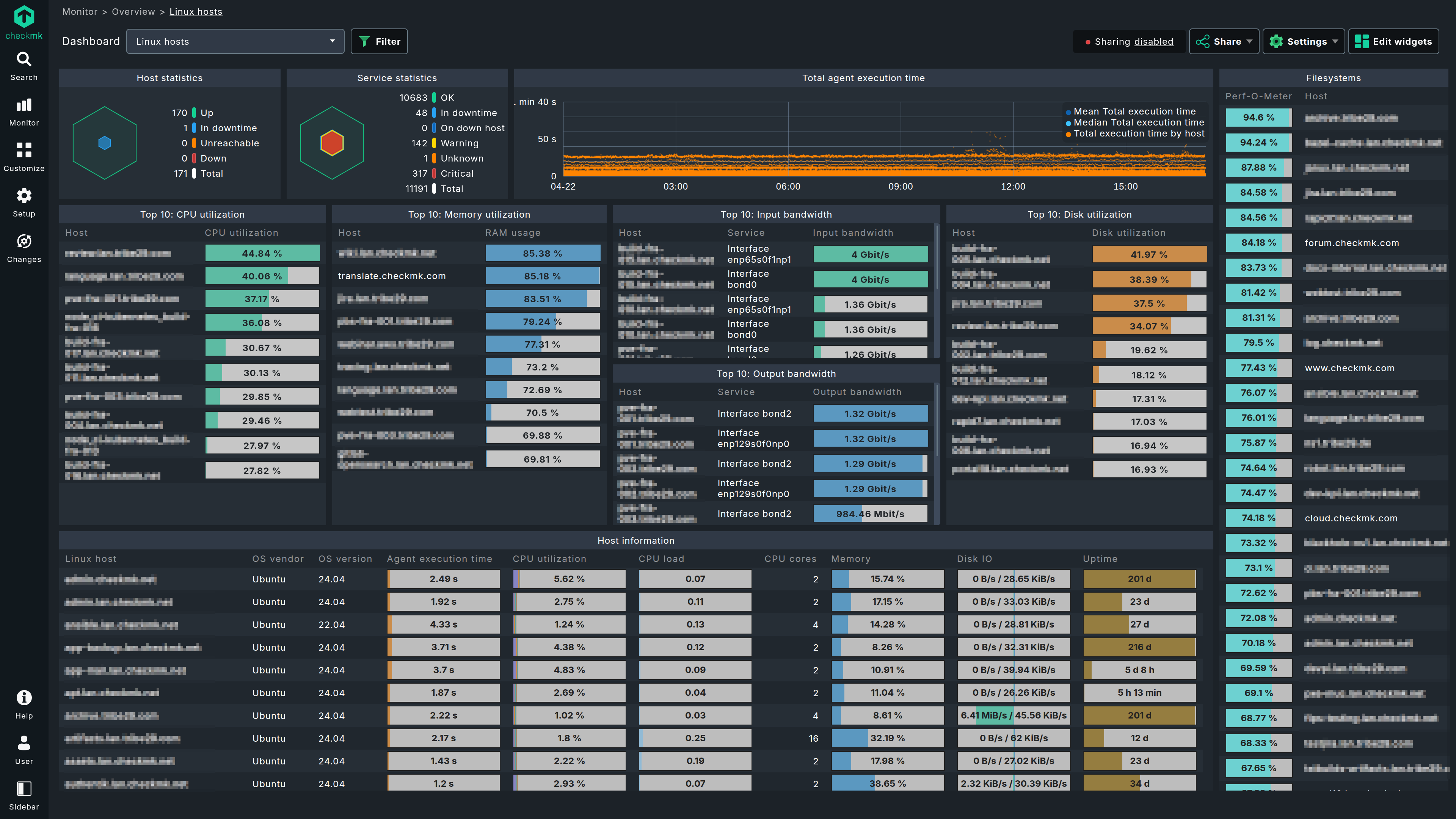 La piattaforma è altamente automatizzata, con funzionalità di scoperta dei servizi e configurazione basata su regole per ridurre l'impostazione manuale. Si scala in modo efficiente per monitorare migliaia di host e milioni di servizi. Un'interfaccia centrale basata sul web consente agli utenti di gestire la configurazione, visualizzare i dati con dashboard personalizzabili e monitorare le prestazioni del sistema nel tempo. Checkmk può essere distribuito in modo flessibile, venendo come pacchetto per Linux, macchina virtuale per qualsiasi sistema operativo, immagine sui marketplace AWS e Azure, o come appliance fisica.