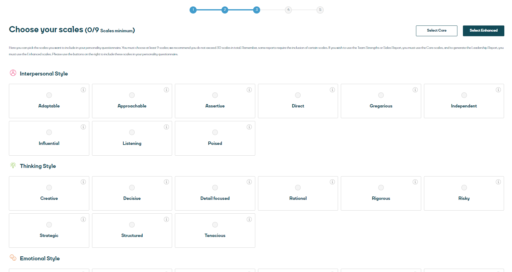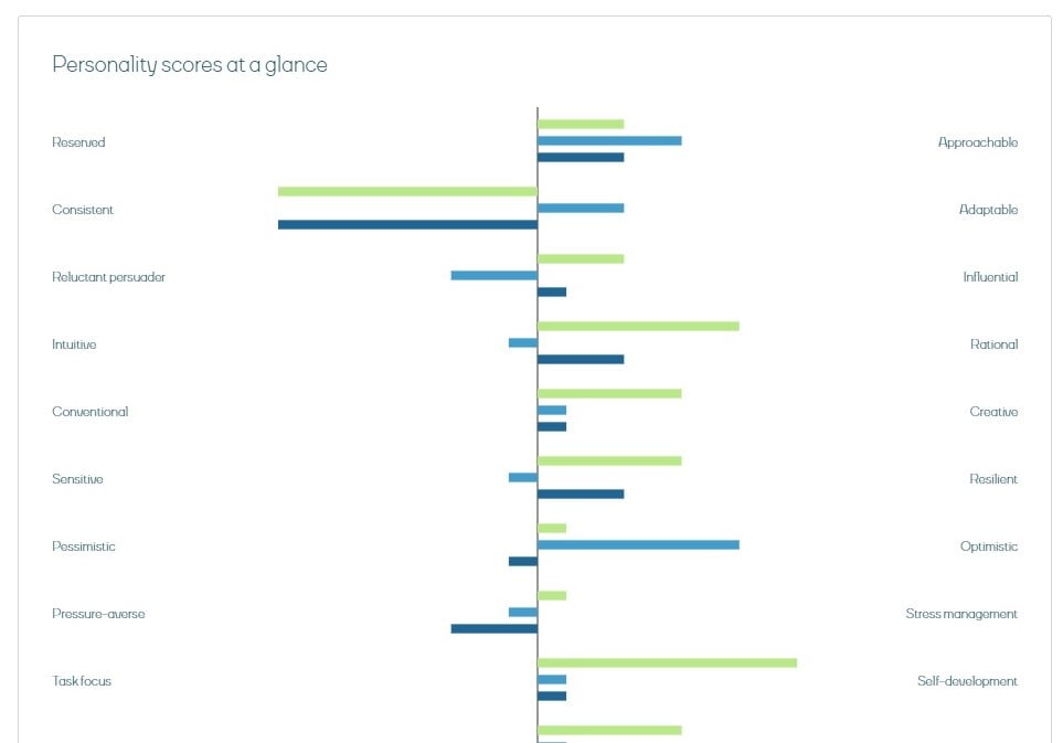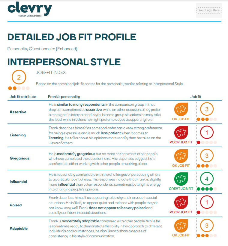 Una caratteristica distintiva di Clevry è il suo quadro di questionari sulla personalità personalizzabile. Questo consente ai clienti di selezionare da una vasta gamma di scale psicometriche validate per creare valutazioni strettamente allineate con i requisiti specifici del lavoro e i criteri di successo organizzativo. Garantendo che le valutazioni riflettano le esigenze uniche dei diversi ruoli, Clevry mantiene la validità scientifica fornendo al contempo intuizioni significative sul potenziale di adattamento dei candidati all'interno dell'organizzazione.