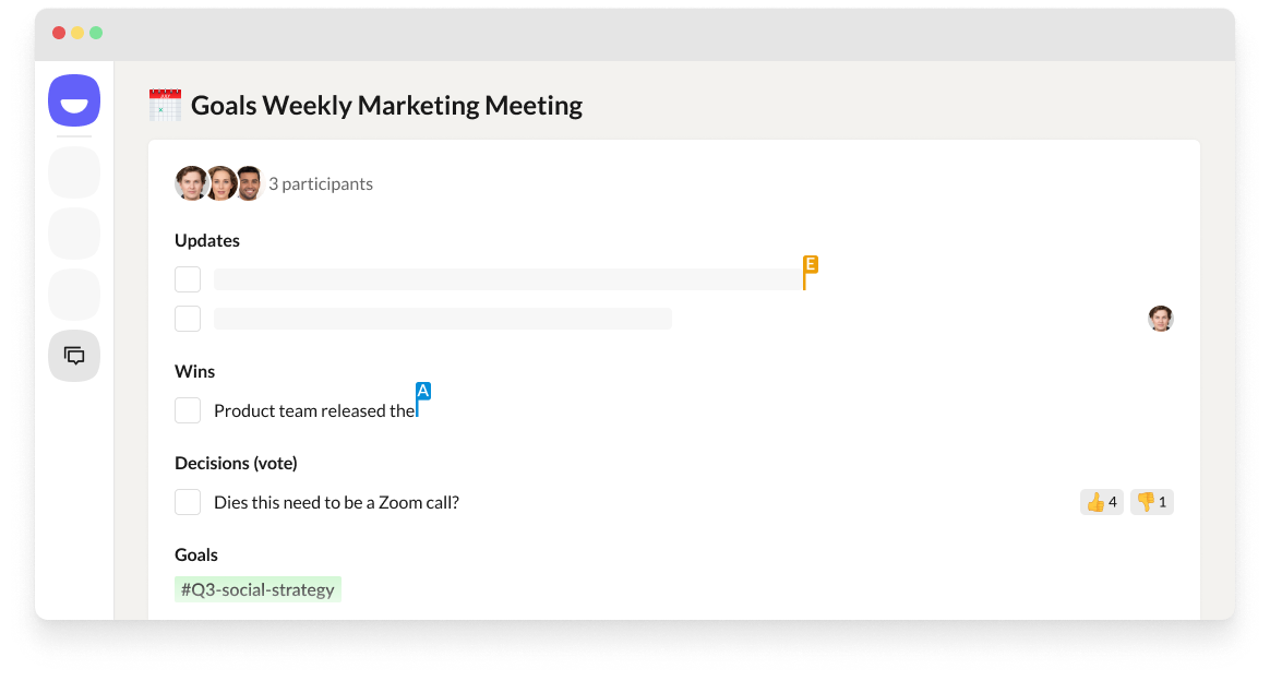 Da quando abbiamo iniziato a usarlo, abbiamo ridotto il tempo che trascorriamo nelle riunioni, e quando ci incontriamo, siamo molto più concentrati. Mi piace il fatto che tutti possano aggiungere aggiornamenti e discutere l'argomento prima che la riunione inizi. Inoltre, le cose da fare che derivano dalle riunioni ora vengono effettivamente monitorate e messe in atto. È stato un grande miglioramento rispetto all'uso di Google Docs per i verbali delle riunioni. Recensione raccolta e ospitata su G2.com.