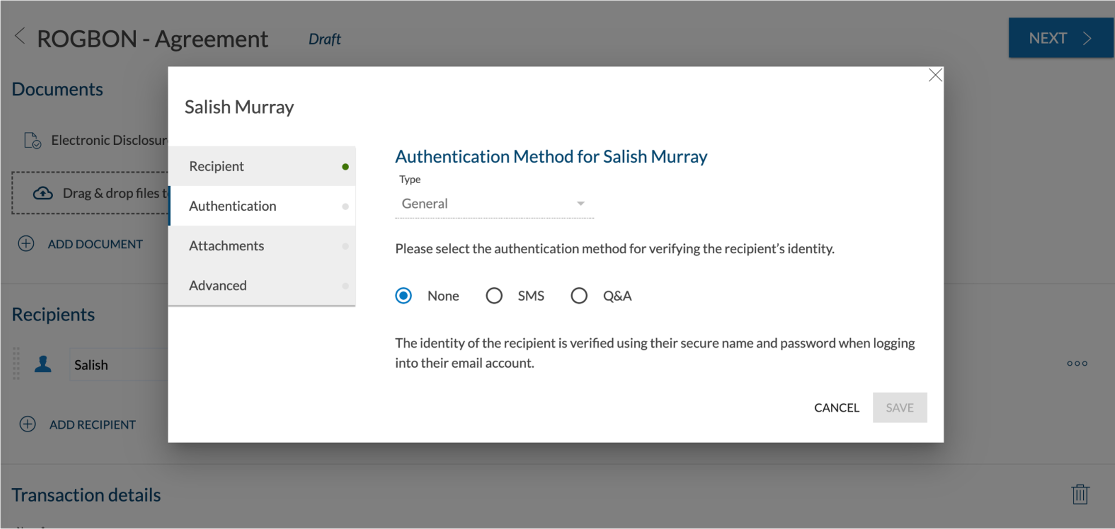 Autenticazione Completa: Scegli tra opzioni di autenticazione del firmatario robuste, tra cui email, PIN SMS, autenticazione basata sulla conoscenza (KBA), controllo ID governativo, confronto biometrico e altro.