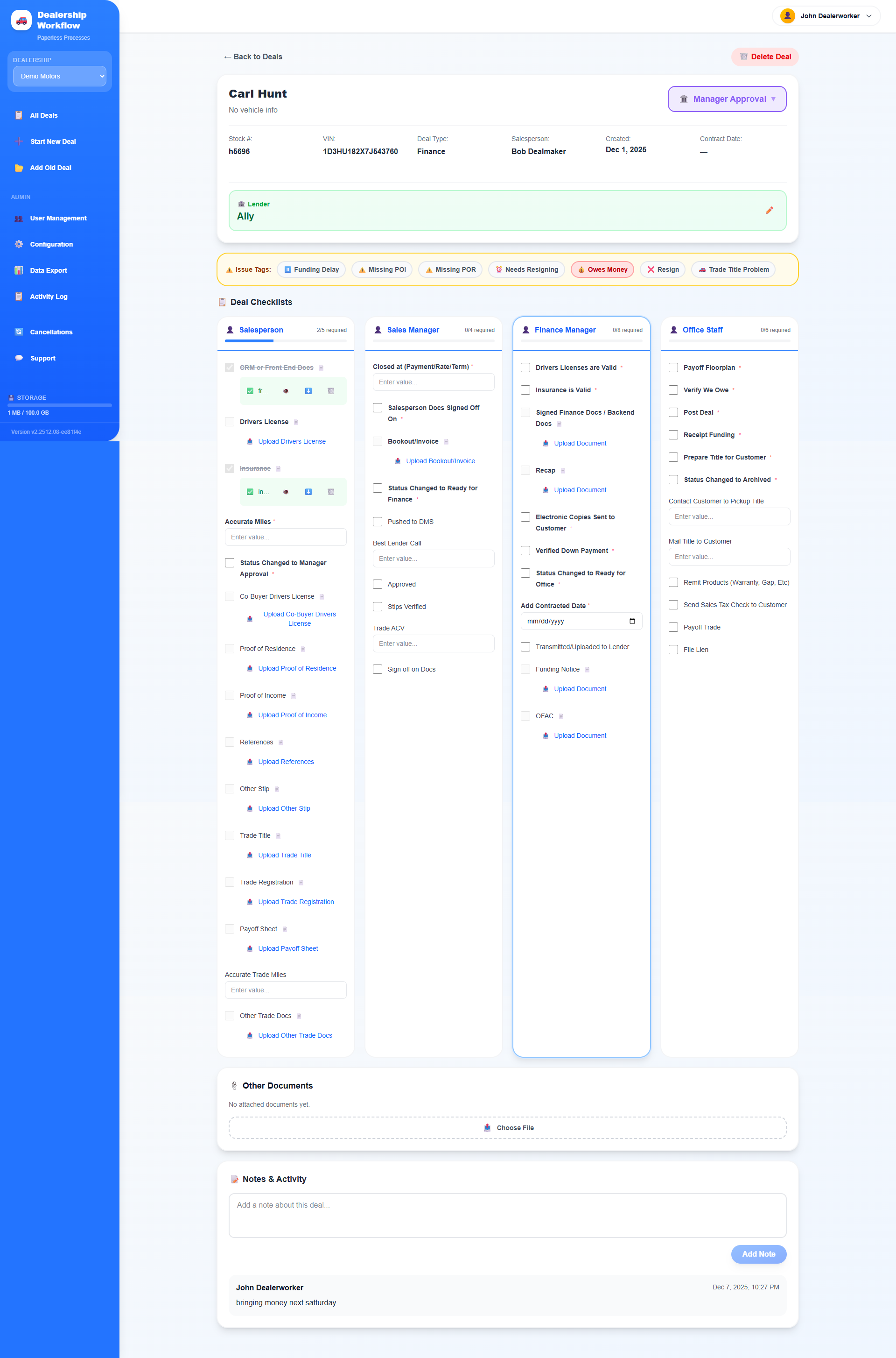 La cartella digitale sostituisce tutto ciò che gestivamo con le cartelle di carta manila. Ogni affare ha una casa digitale completa: documenti, liste di controllo, aggiornamenti di stato e un audit trail completo. Il modulo di tracciamento delle cancellazioni F&I da solo ci ha salvato dal perdere di vista i chargeback che prima sfuggivano nei fogli di calcolo. Le liste di controllo basate sui ruoli garantiscono che nulla venga trascurato prima che un affare passi alla fase successiva. Recensione raccolta e ospitata su G2.com.
