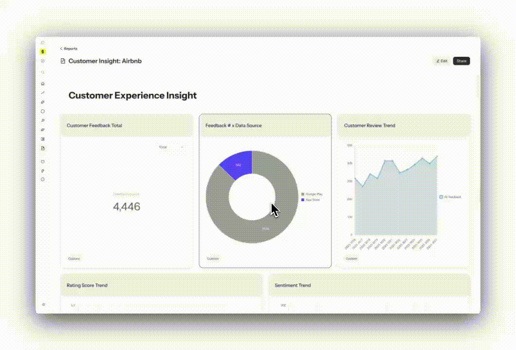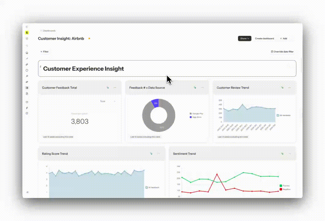 Syncly collega i dati di supporto interni con il feedback sociale esterno per ampliare la visibilità sul sentiment dei clienti. Questo include il monitoraggio delle piattaforme sociali dove i clienti discutono dei prodotti senza aprire ticket o lasciare recensioni, e catturare il contesto che potrebbe essere perso da approcci solo testuali. I team possono utilizzare dashboard per monitorare il volume degli argomenti, i cambiamenti di sentiment e i modelli emergenti nel tempo, e impostare avvisi per evidenziare picchi di feedback negativo, aumenti improvvisi in un argomento o altri segnali che potrebbero richiedere attenzione.