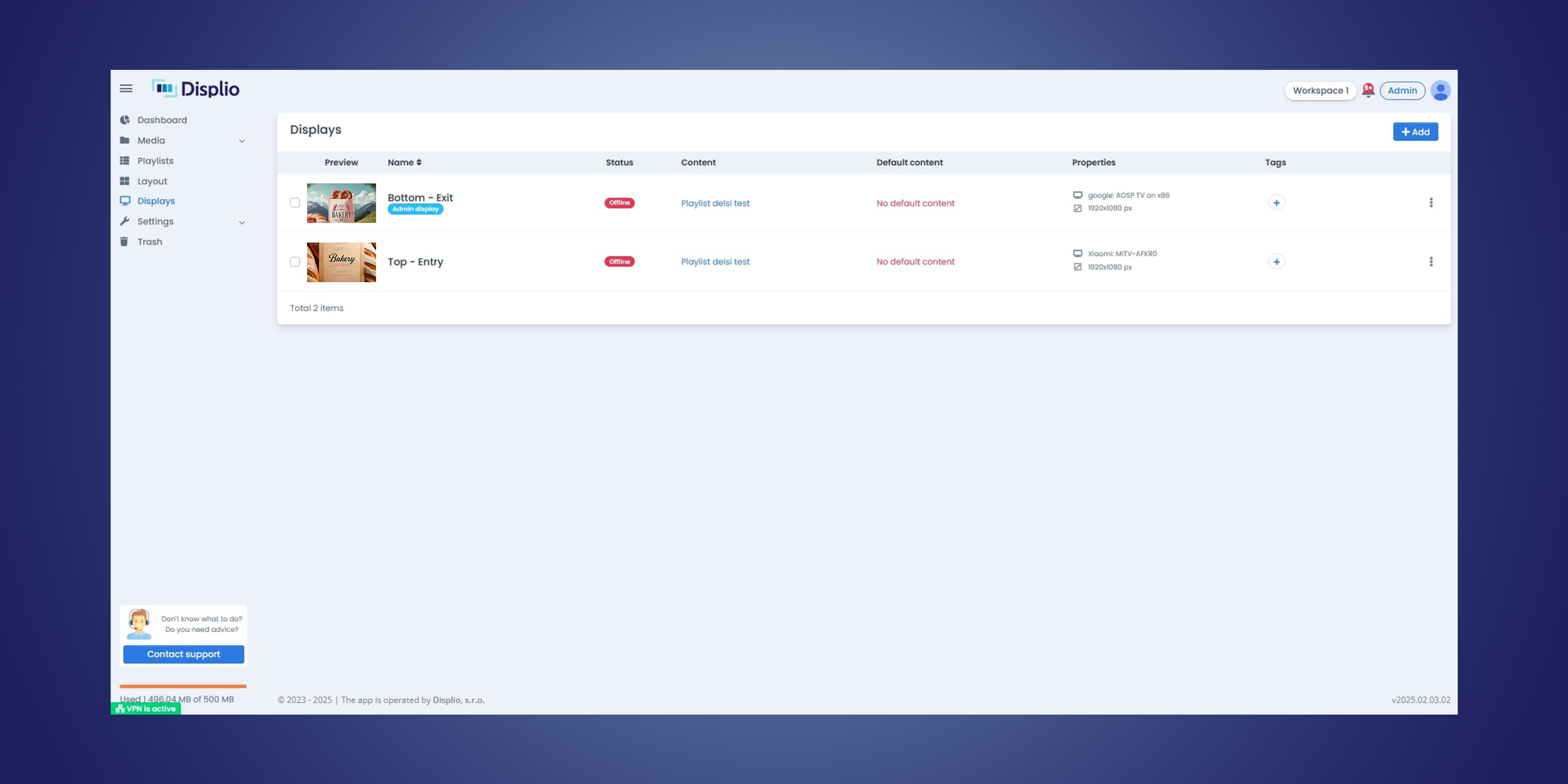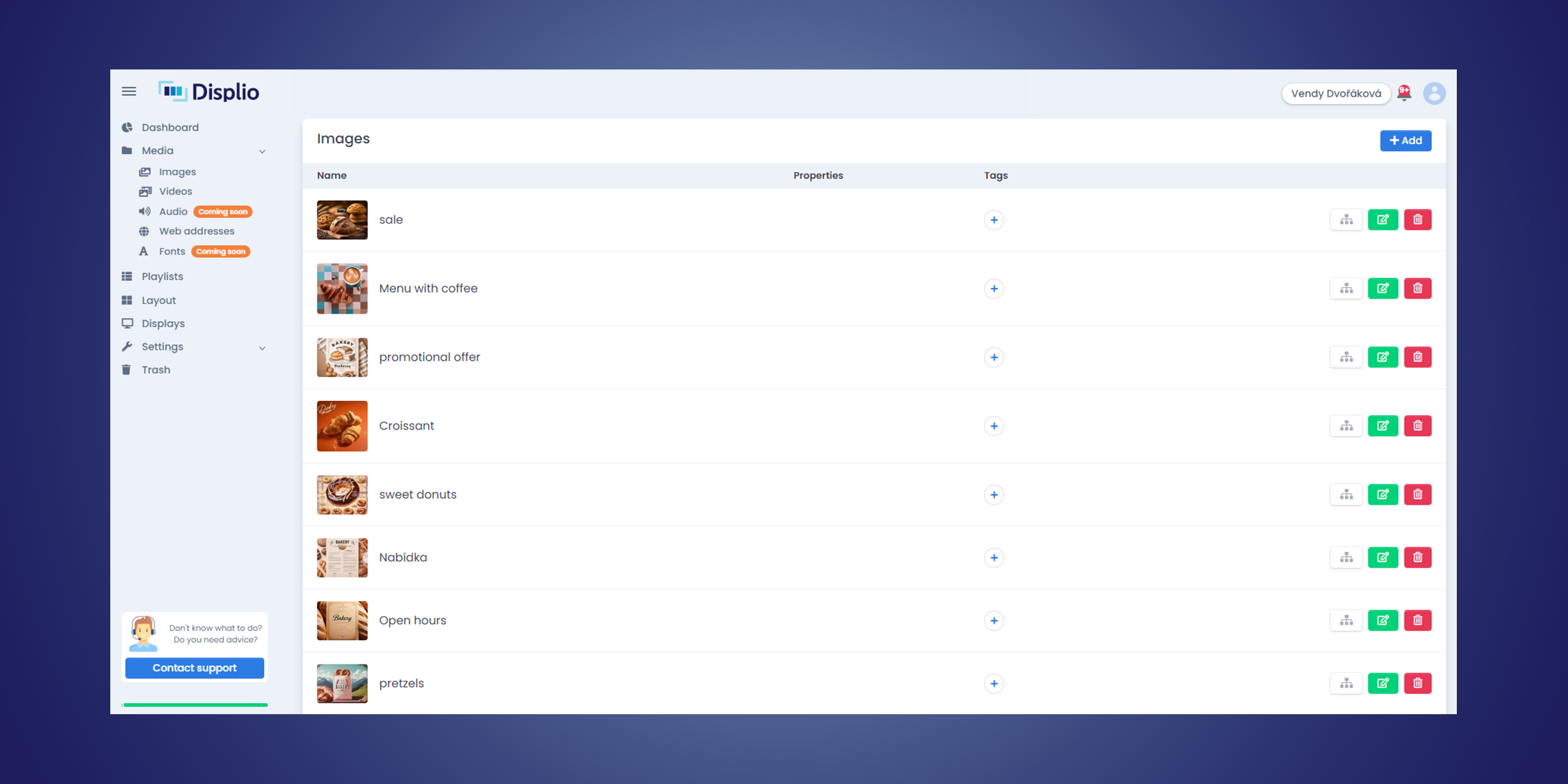 Come sistema di gestione dei contenuti per la segnaletica digitale, Displio fornisce strumenti per organizzare e distribuire contenuti visivi in ambienti in cui le informazioni devono essere aggiornate regolarmente o sincronizzate in più sedi. La piattaforma supporta i formati comuni di contenuti per la segnaletica digitale, inclusi immagini, video, playlist e contenuti basati sul web o provenienti da fonti esterne, permettendo agli utenti di combinare informazioni statiche e dinamiche sui loro display.