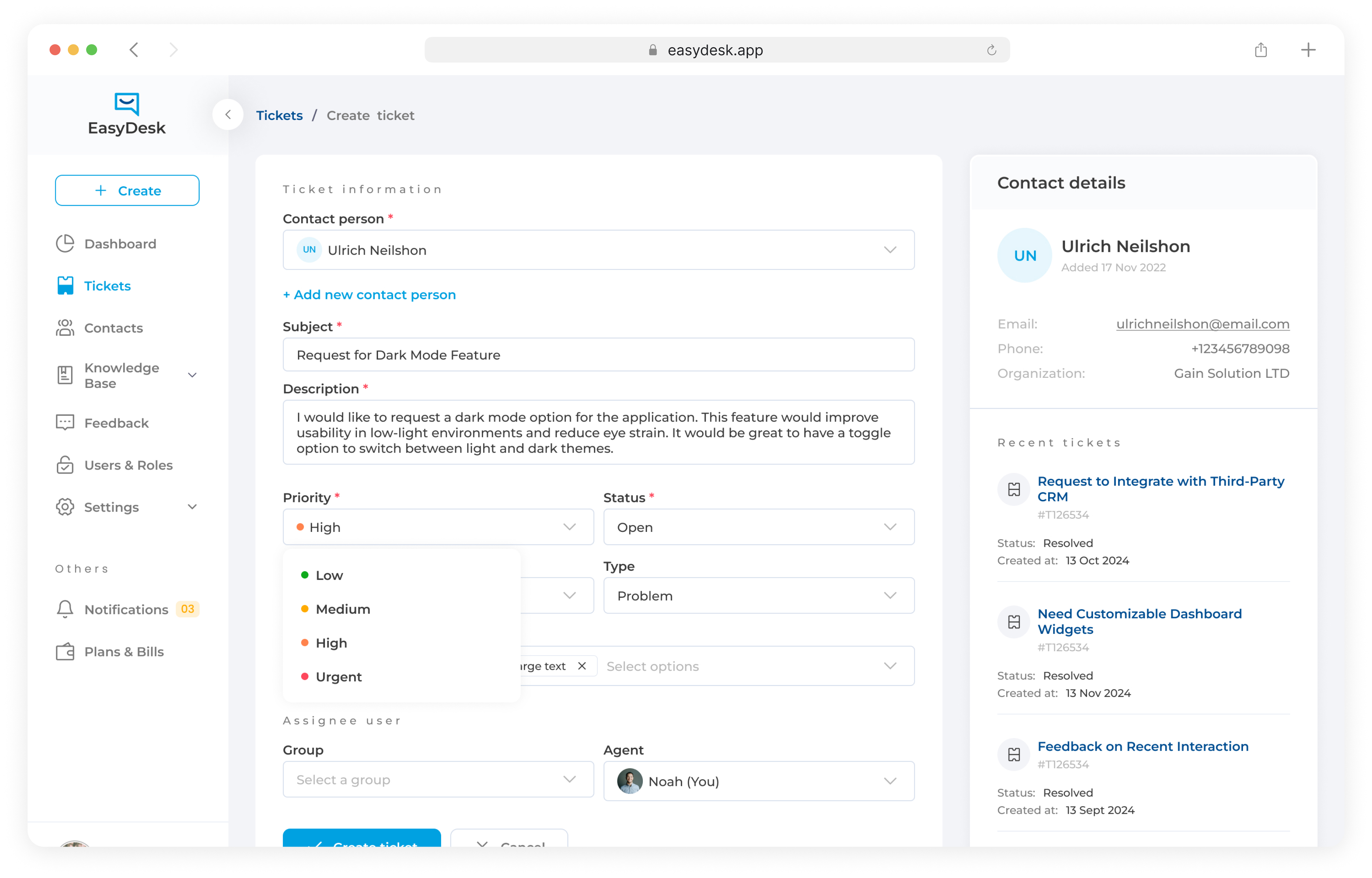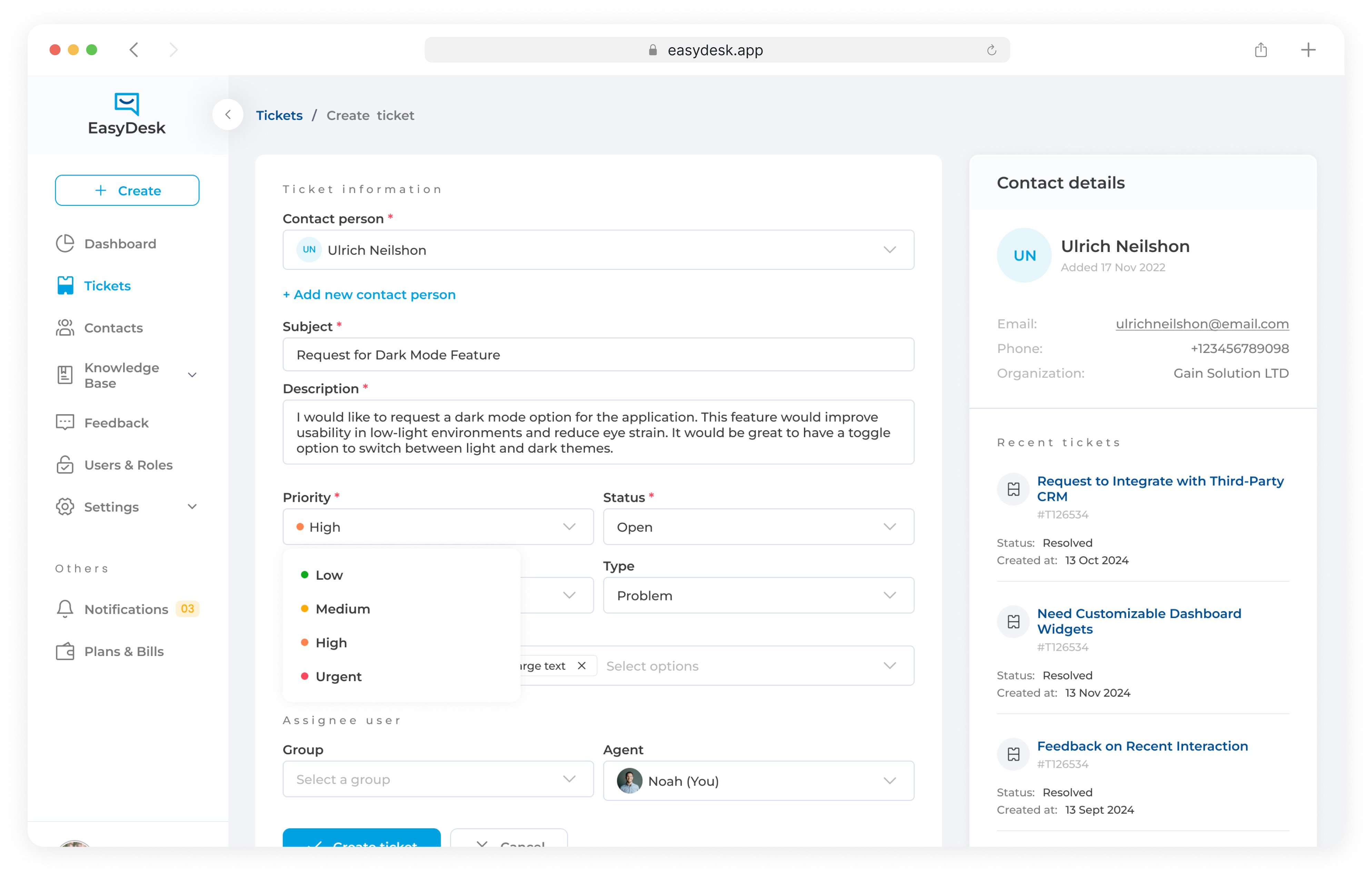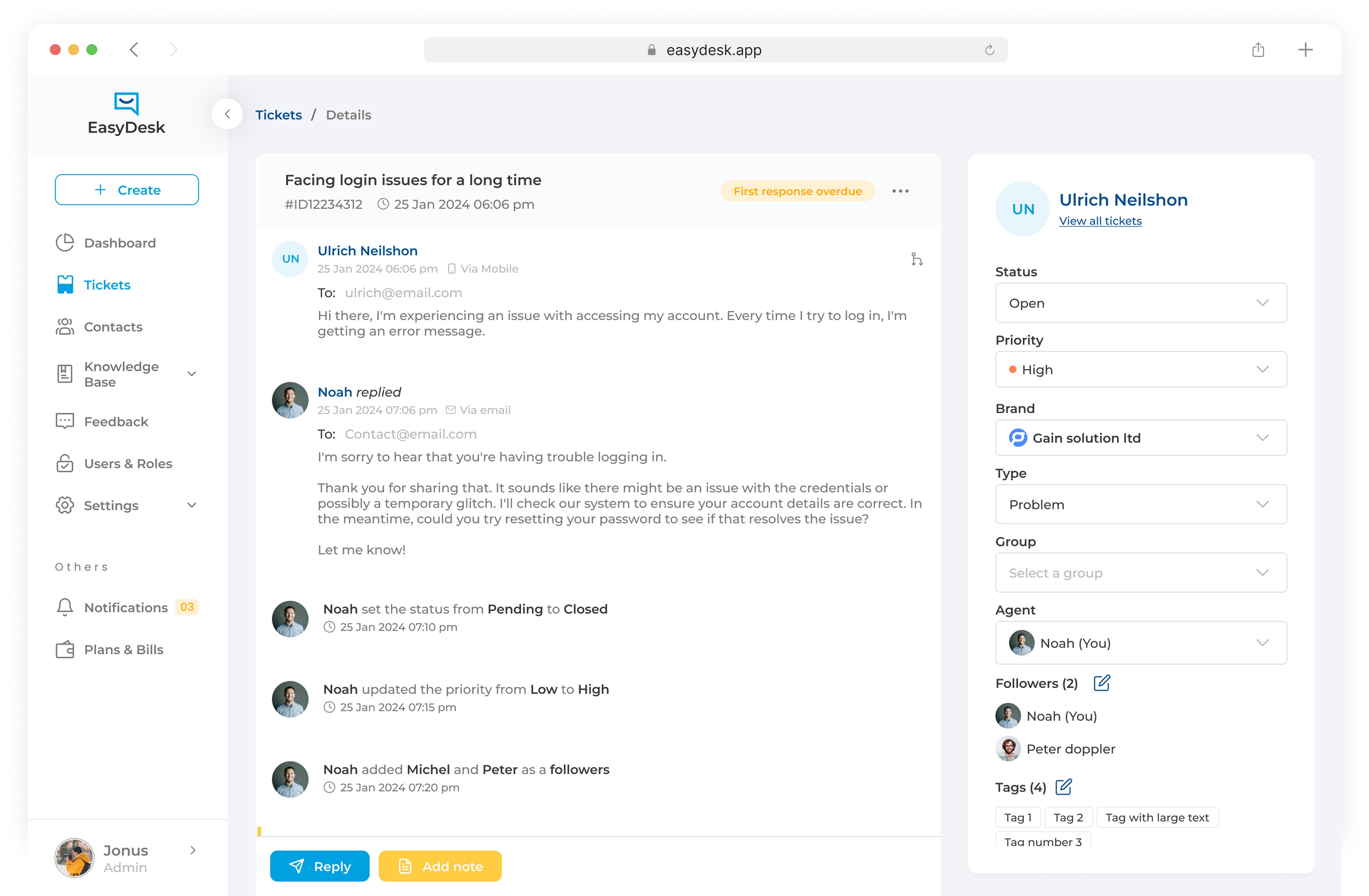 Zoho Desk raccoglie tutte le interazioni con i clienti da diversi canali in un'unica interfaccia pulita. Puoi quindi continuare queste conversazioni senza problemi e aiutare i clienti facilmente.