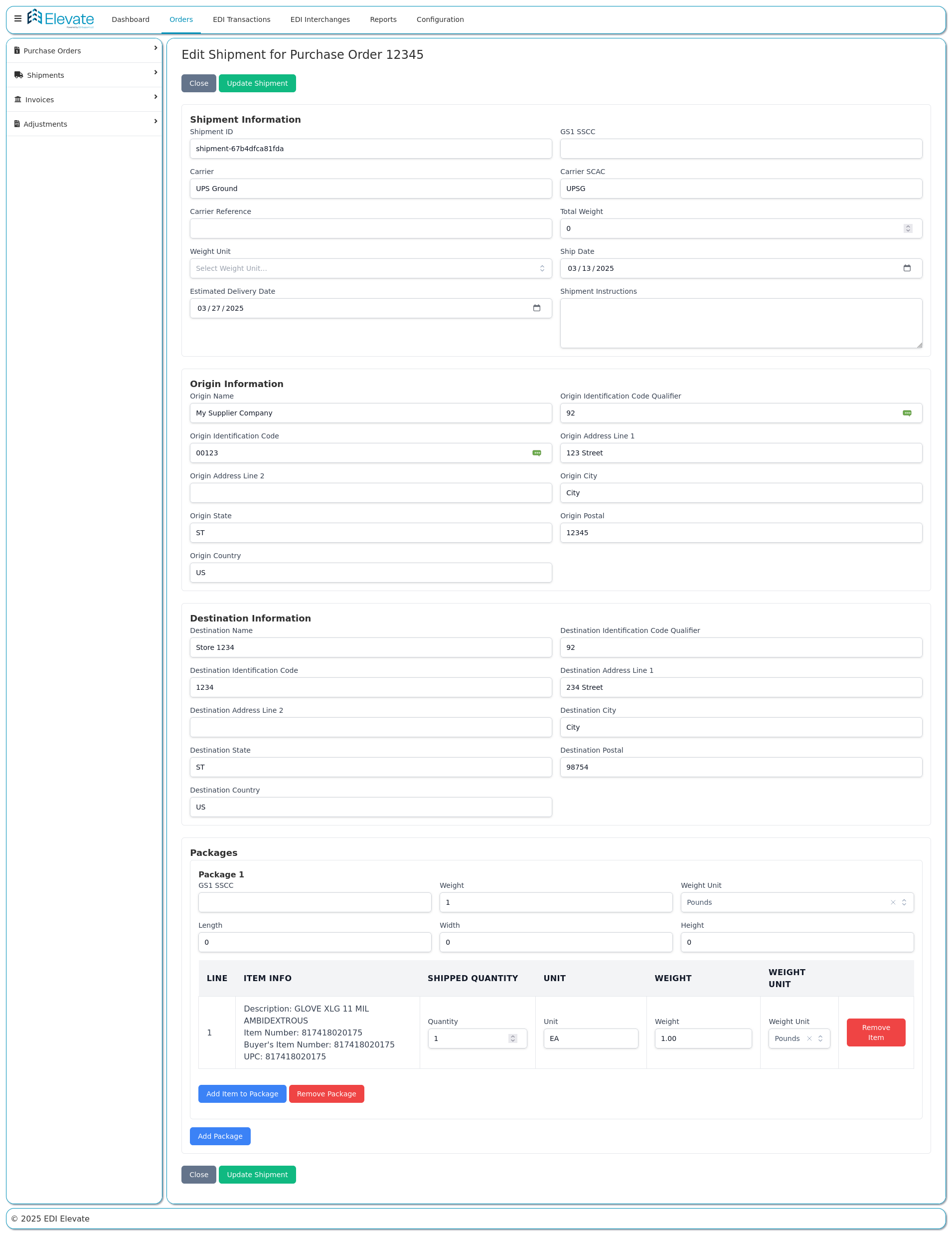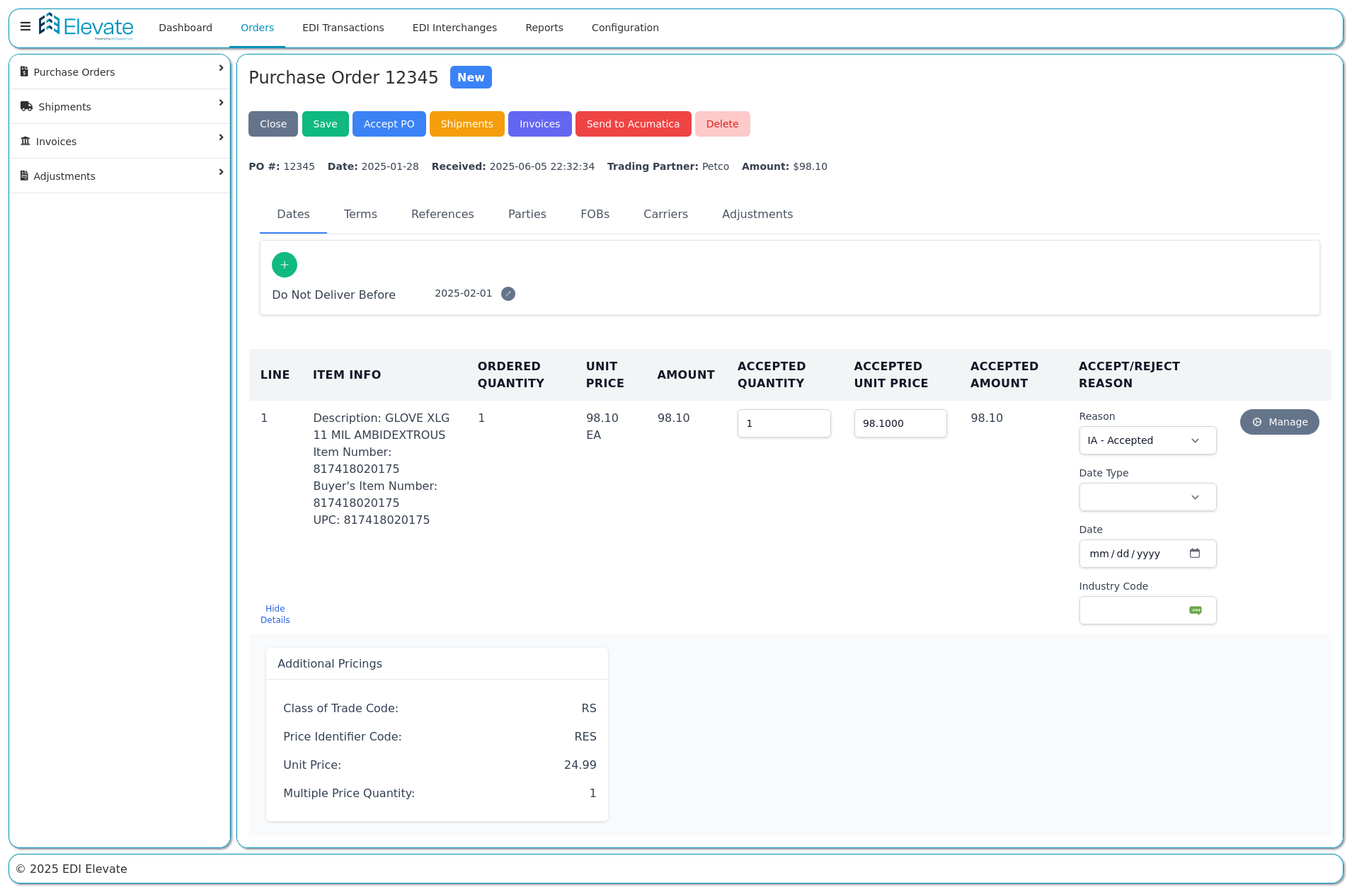 The Purchase Order Detail (EDI 850) screen gives a complete view of each order, including line items, quantities, pricing, and partner requirements. SMBs can accept or reject orders, generate shipments, and send invoices directly from this view. With Elevate, order processing is faster, clearer,...