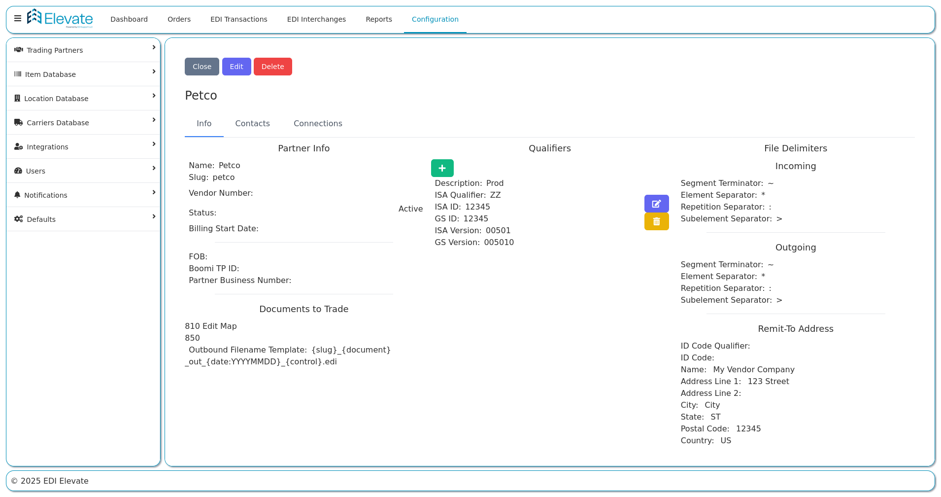 Elevate makes it easy to onboard and manage trading partners. The Trading Partner Profile screen centralizes vendor details, EDI qualifiers, file formats, and maps. Complex requirements like delimiters and document templates are already built in—so SMBs can connect with retailers, distributors, a...