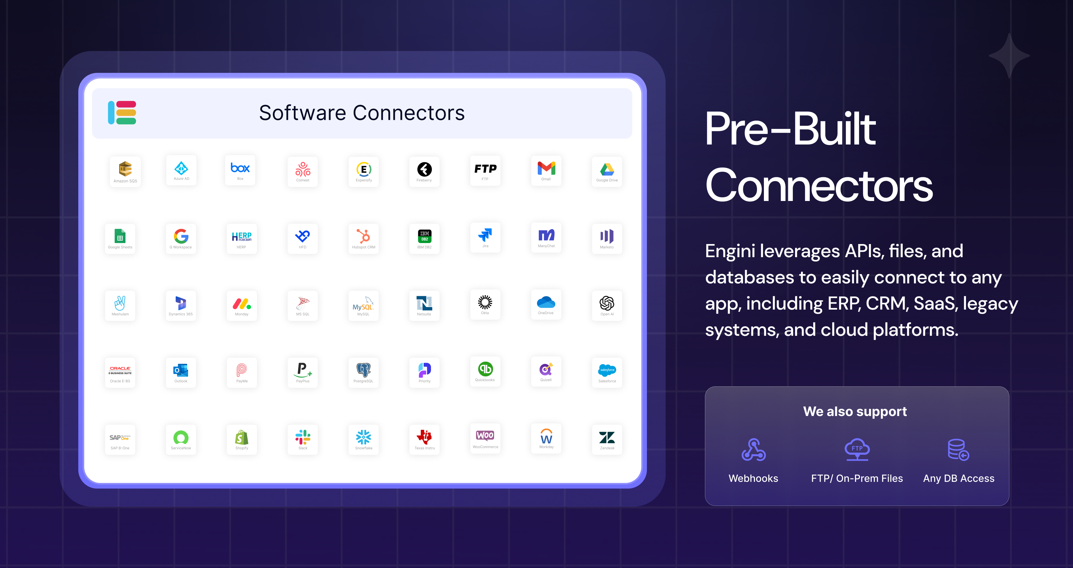 Per rendere l'integrazione senza sforzo, Engini include una vasta libreria di connettori pre-costruiti per applicazioni popolari come Salesforce, QuickBooks, Priority ERP e Shopify. Questi connettori consentono integrazioni rapide e facili, mentre le API permettono alle aziende di creare soluzioni personalizzate per sistemi specializzati, garantendo una copertura completa per qualsiasi processo aziendale.
