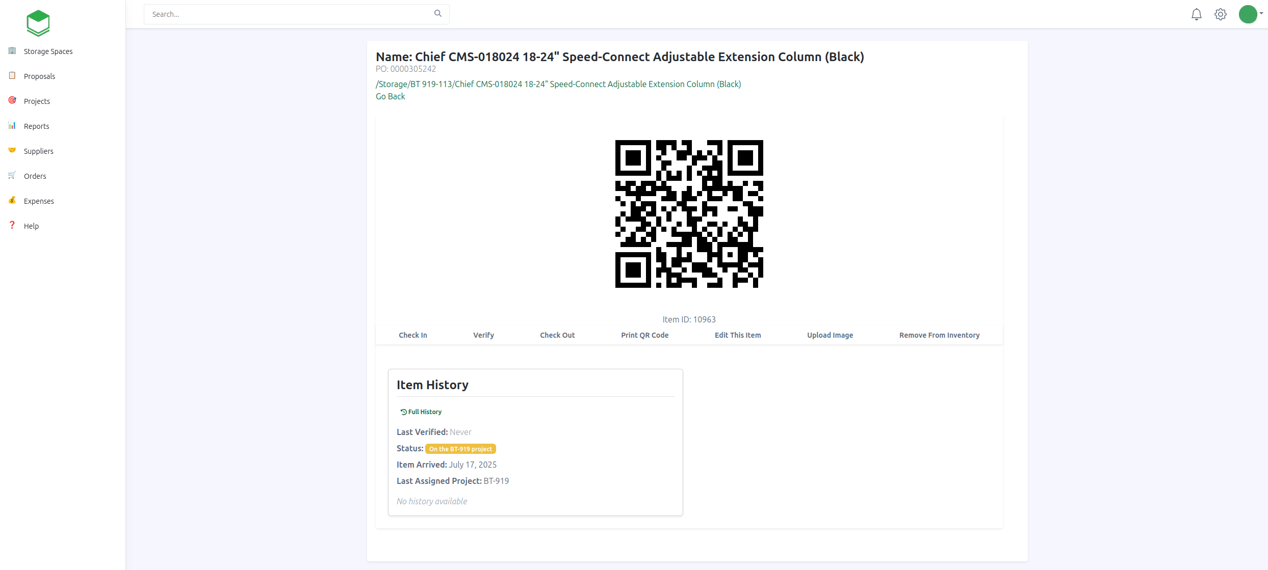 Non c'è bisogno di attrezzature speciali per scansionare il tuo inventario con Find Boxes; gli utenti possono semplicemente usare il loro telefono. Al momento della scansione di un codice QR, gli utenti vengono indirizzati a una pagina web con tutti i dettagli sul tuo equipaggiamento. Vedi la cronologia degli articoli, i prossimi check-out, i progetti assegnati, la posizione di stoccaggio e le note sugli articoli tutto in un unico posto.