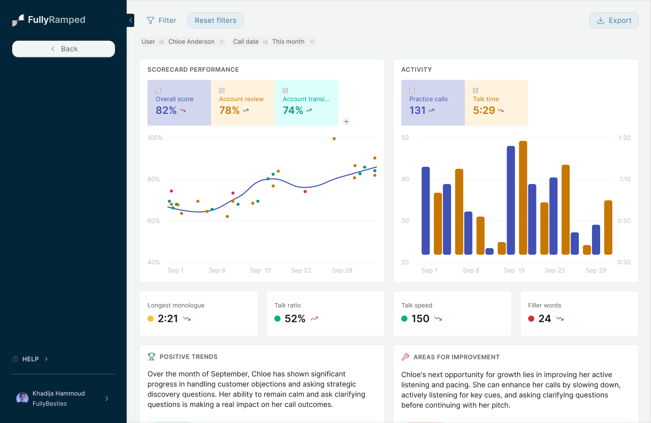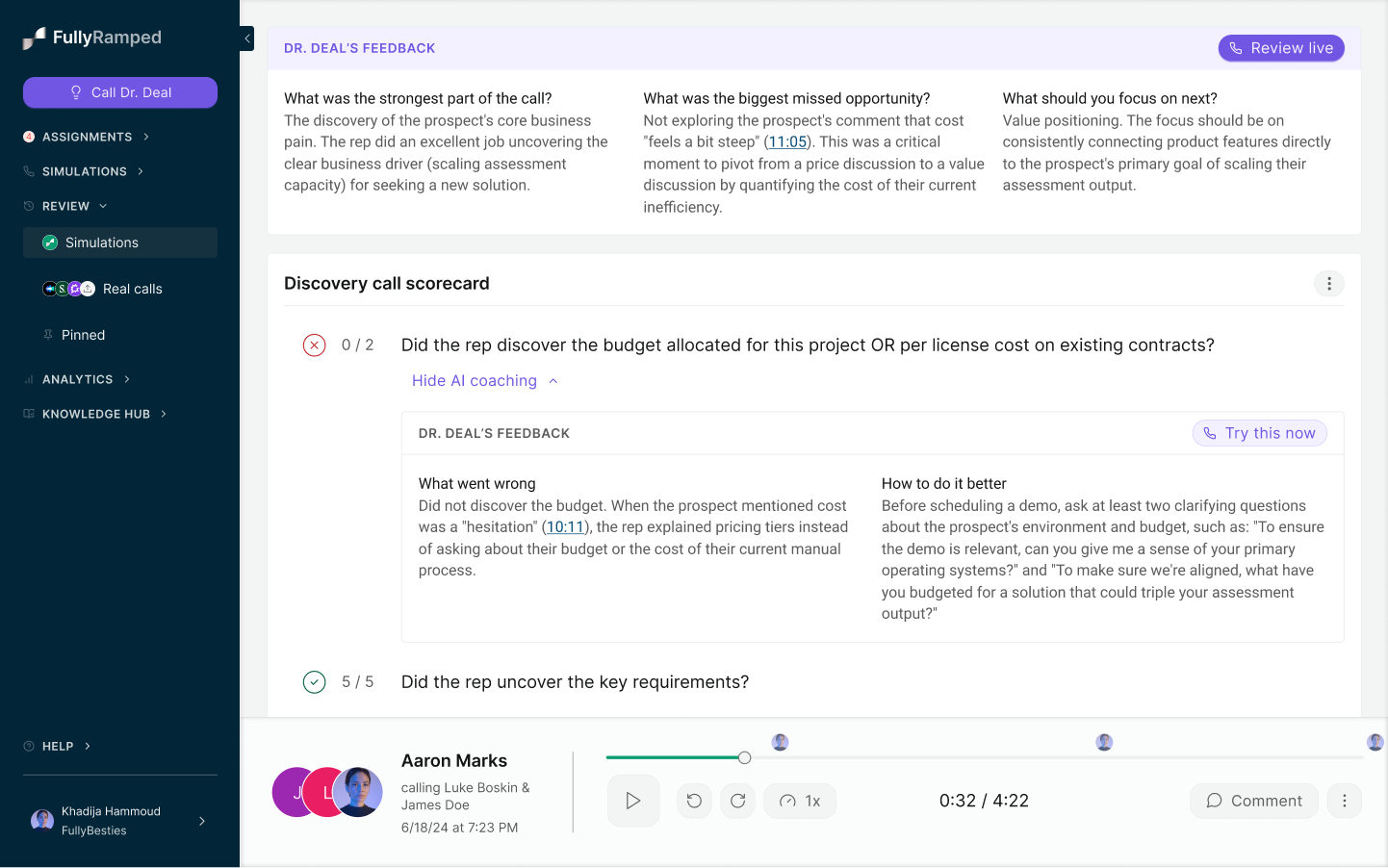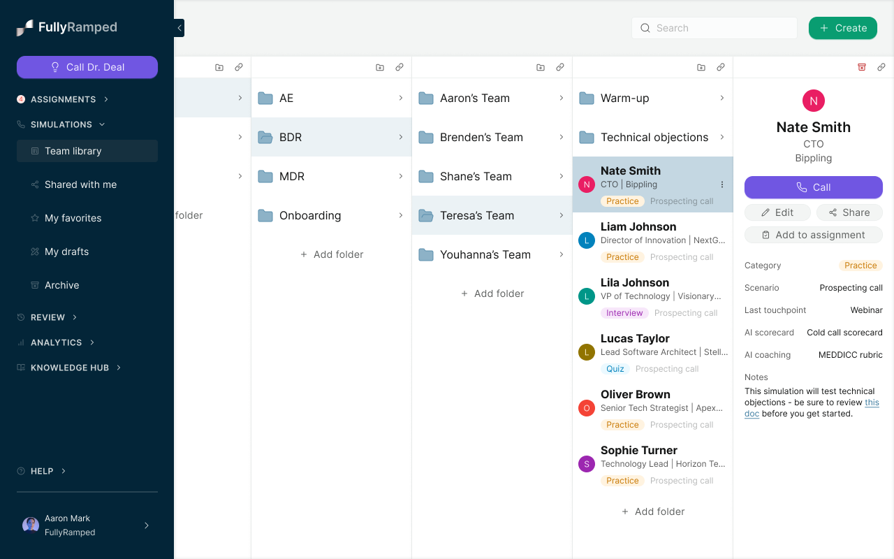 È stato anche un enorme risparmio di tempo per me. Soprattutto, non sono più un collo di bottiglia per lo sviluppo dei miei rappresentanti poiché non devono aspettare che io sia disponibile per fare un role play di persona. Inoltre, tutto ciò che ho dovuto fare è stato creare un solo personaggio e posso rapidamente scalare quello in diversi scenari (gestione delle obiezioni, chiamate a personaggi di diversi livelli, ecc.).
