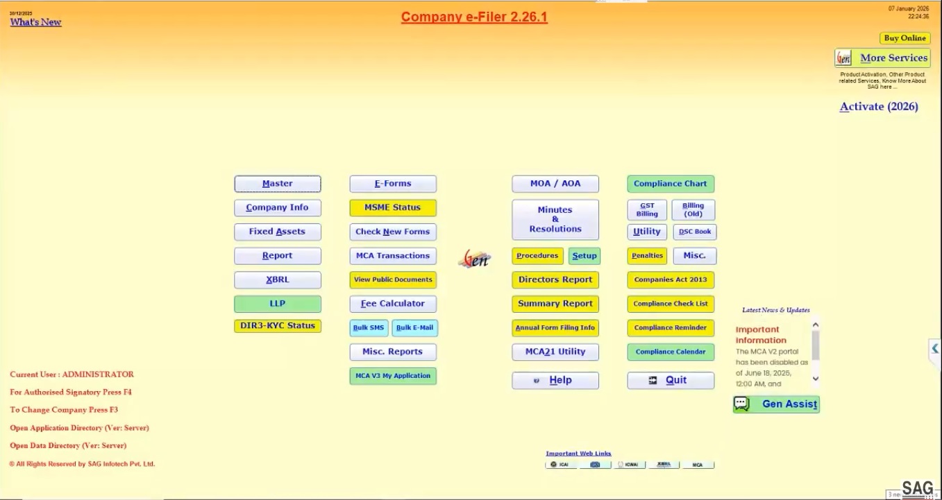 A differenza della concorrenza, Gen CompLaw offre prestazioni affidabili nella gestione di attività importanti grazie al suo design intuitivo e ai tempi di risposta rapidi. Una delle caratteristiche più notevoli di Gen CompLaw è la sua ampia capacità di deposito MCA/ROC. Le aziende possono facilmente eseguire il deposito MCA/ROC con il suo aiuto, garantendo la conformità a tutte le normative applicabili. Il programma facilita il deposito ai sensi del Companies Act 1956/2013 supportando una moltitudine di e-forms, come AOC-4, MGT-7, MGT-7A, ADT-1 e e-forms LLP (3,8,11,12,15), tra molti altri. Un punto di riferimento unico per una gestione efficiente dei registri è offerto dal software di deposito Gen CompLaw ROC, che crea automaticamente registri statutari chiave come Azionisti, Trasferimento Azioni, MBP-1 e Carica.