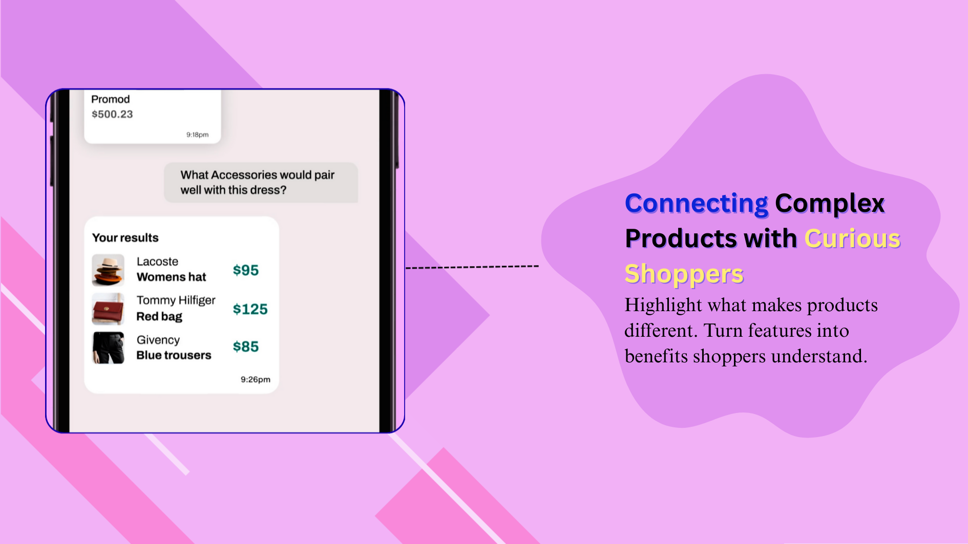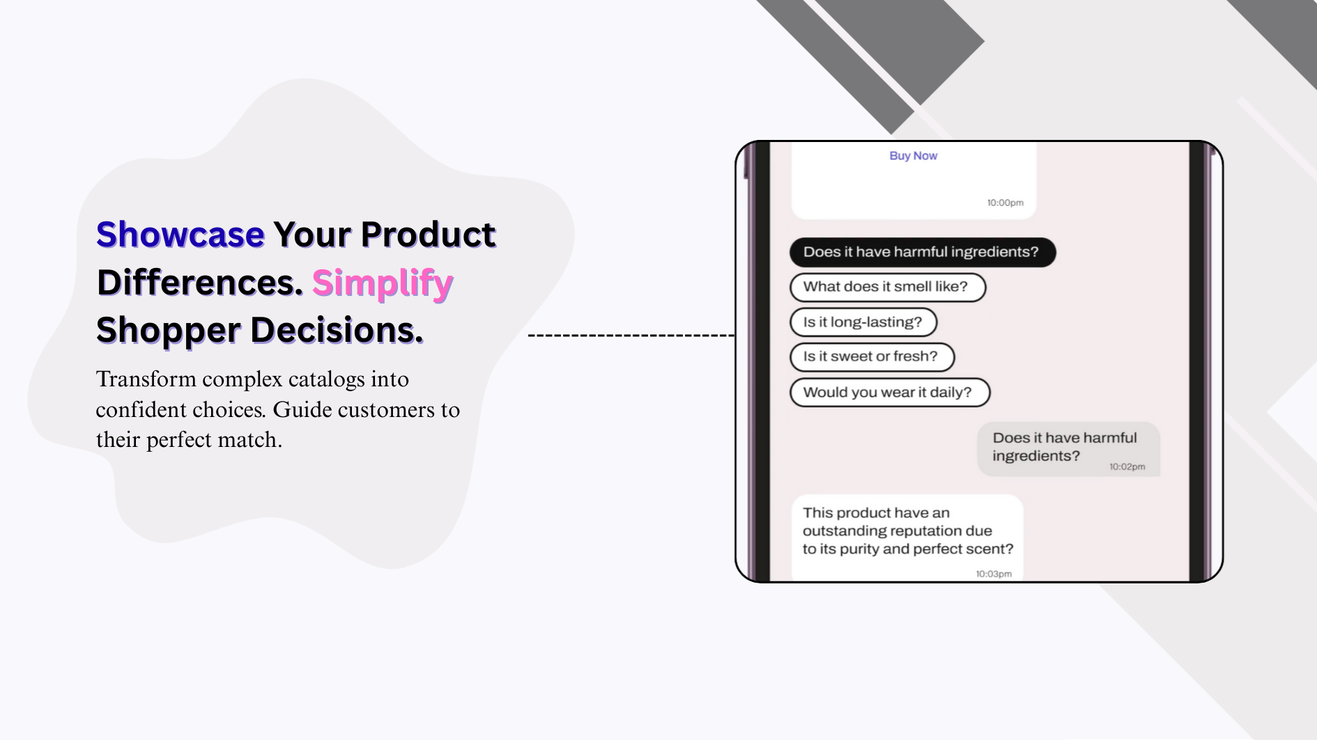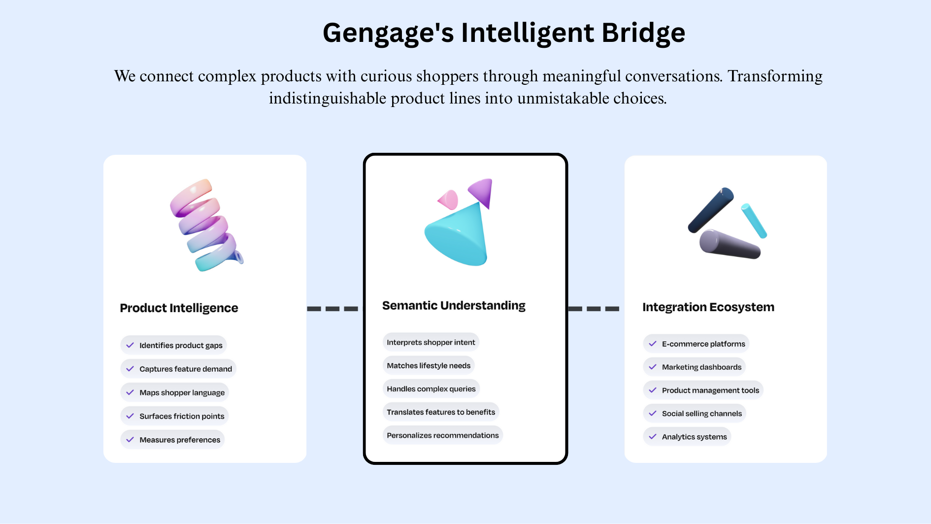 Molti "brand di e-commerce" si affidano a Gengage non solo per aumentare le vendite ma anche per risparmiare tempo e ridurre il carico di lavoro sui team di supporto. Automatizzando compiti ripetitivi, offrendo suggerimenti di prodotti su misura su larga scala e mantenendo gli acquirenti coinvolti dall'inizio alla fine, Gengage diventa una vera estensione del team di vendita. Dall'aiutare i clienti a scegliere tra prodotti simili all'aumentare degli acquisti ripetuti, trasforma il modo in cui i brand si connettono con gli acquirenti — 24/7.