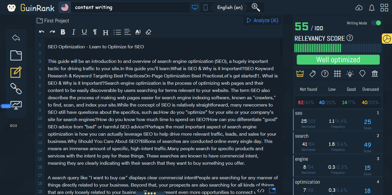 La facilità d'uso e le molteplici funzionalità preziose come l'analizzatore di parole chiave e pagine, l'ottimizzatore di contenuti e il cercatore di nicchie sono strumenti utili. E funzionano piuttosto bene. Recensione raccolta e ospitata su G2.com.