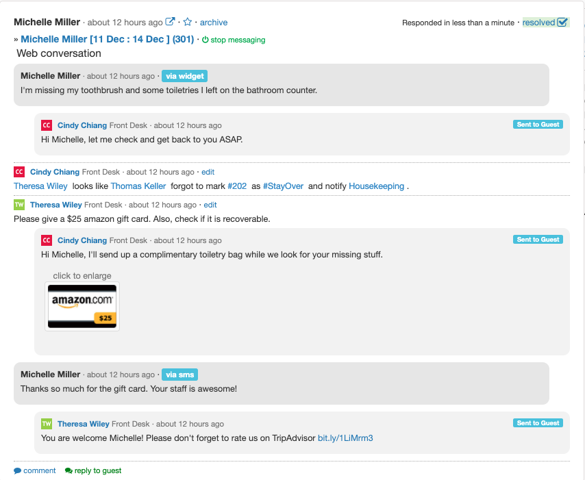 La Voce AI risponde alle chiamate 24/7 in oltre 100 lingue, gestendo il 70-82% delle richieste di routine e prenotando camere direttamente tramite l'integrazione con il PMS. La Messaggistica AI per gli Ospiti automatizza le conversazioni via SMS, WhatsApp e chat web catturando le preferenze degli ospiti. Il modulo per le pulizie utilizza l'ottimizzazione dell'assegnazione delle camere alimentata dall'IA con monitoraggio dello stato in tempo reale, liste di controllo mobili e analisi delle prestazioni. Il check-in senza contatto consente agli ospiti di registrarsi digitalmente con verifica dell'ID, firme elettroniche e chiavi mobili - senza necessità di scaricare un'app. La collaborazione del personale sostituisce radio e registri cartacei con messaggistica unificata e gestione delle attività.