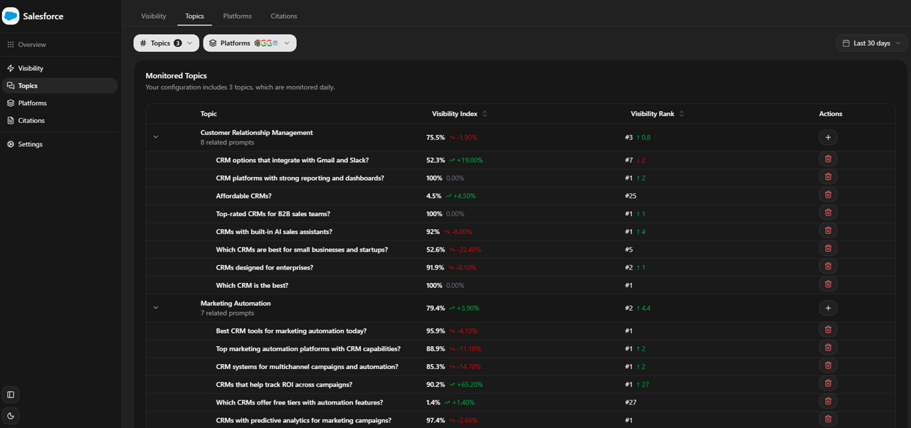 Writesonic è la piattaforma GEO/AEO completa che traccia la visibilità di ricerca AI del tuo marchio, identifica dove i concorrenti ti superano ed esegue le correzioni—creando nuovi contenuti, aggiornando le pagine esistenti, ottenendo citazioni e interagendo su Reddit.