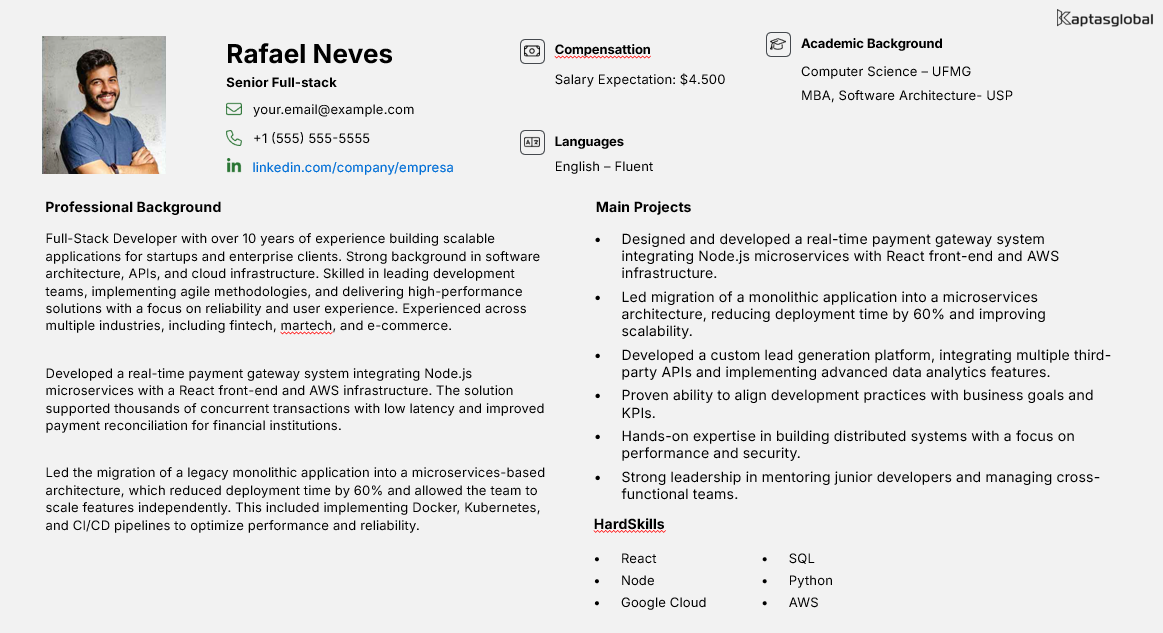 Ciò che mi ha veramente colpito di Kaptas Global è stata la loro eccezionale efficienza e professionalità. Il processo è andato avanti rapidamente, ma non è mai sembrato affrettato o stressante in alcun momento. La comunicazione è stata costantemente chiara, assicurandomi di capire sempre cosa aspettarmi ad ogni passo. Ho trovato anche la loro piattaforma di gestione delle risorse umane altamente efficace, poiché ha reso i compiti amministrativi e l'inserimento del personale straordinariamente fluidi. Recensione raccolta e ospitata su G2.com.