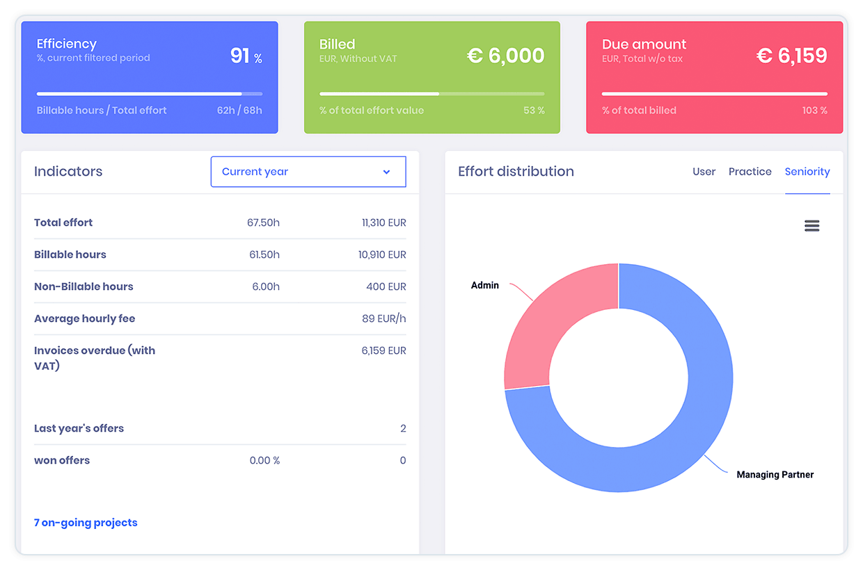Oltre alla gestione operativa, KeyVision PRO include strumenti finanziari e di performance integrati che consentono agli studi di monitorare la redditività in tempo reale. Il monitoraggio del tempo, la fatturazione e la gestione delle spese sono collegati senza soluzione di continuità a ciascun caso, offrendo piena visibilità sui costi e sui ricavi sia a livello di questione che di cliente. Reportistica e analisi integrate forniscono approfondimenti utili sulle prestazioni del team, distribuzione del carico di lavoro e salute finanziaria, aiutando i decisori a ottimizzare l'allocazione delle risorse e migliorare l'efficienza complessiva.