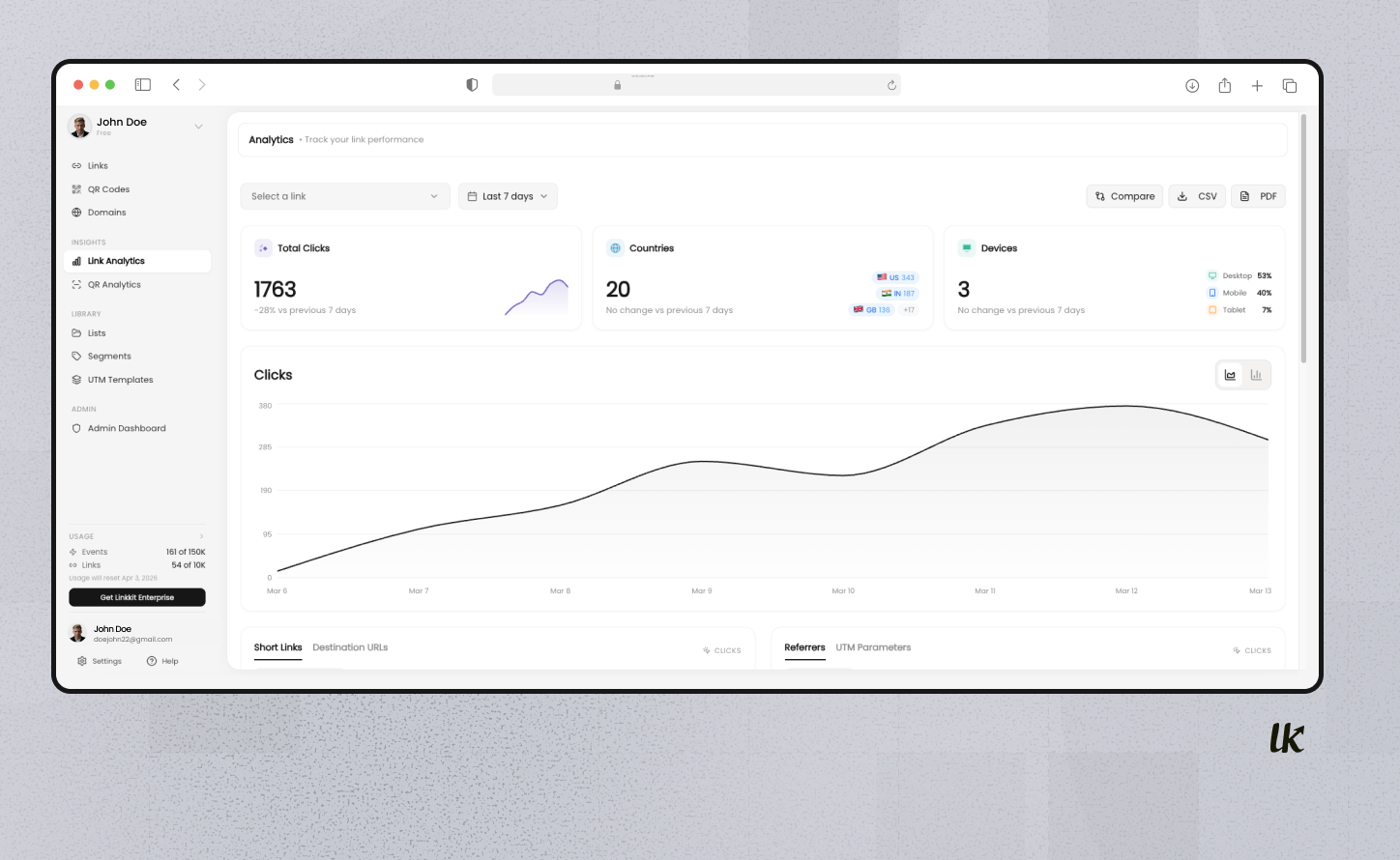 - Analisi e Reportistica: Accedi a analisi complete, inclusi conteggi di clic, dati geografici, tipi di dispositivi e fonti di riferimento, per valutare le prestazioni dei link e informare le strategie di marketing.