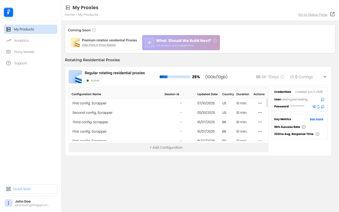 - Geo-Targeting: Possibilità di selezionare IP da paesi, città o stati specifici in oltre 180 località, consentendo test regionali precisi e raccolta dati.