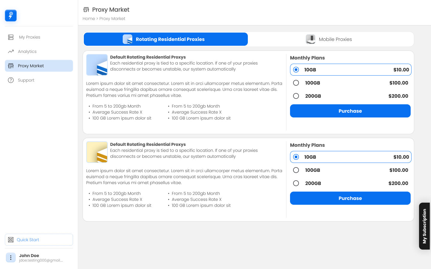 Offrendo una gamma diversificata di tipi di proxy e funzionalità, ProxyJet consente agli utenti di condurre operazioni online efficienti, sicure e scalabili, superando le sfide legate ai ban degli IP, alle restrizioni geografiche e alle limitazioni di accesso ai dati.