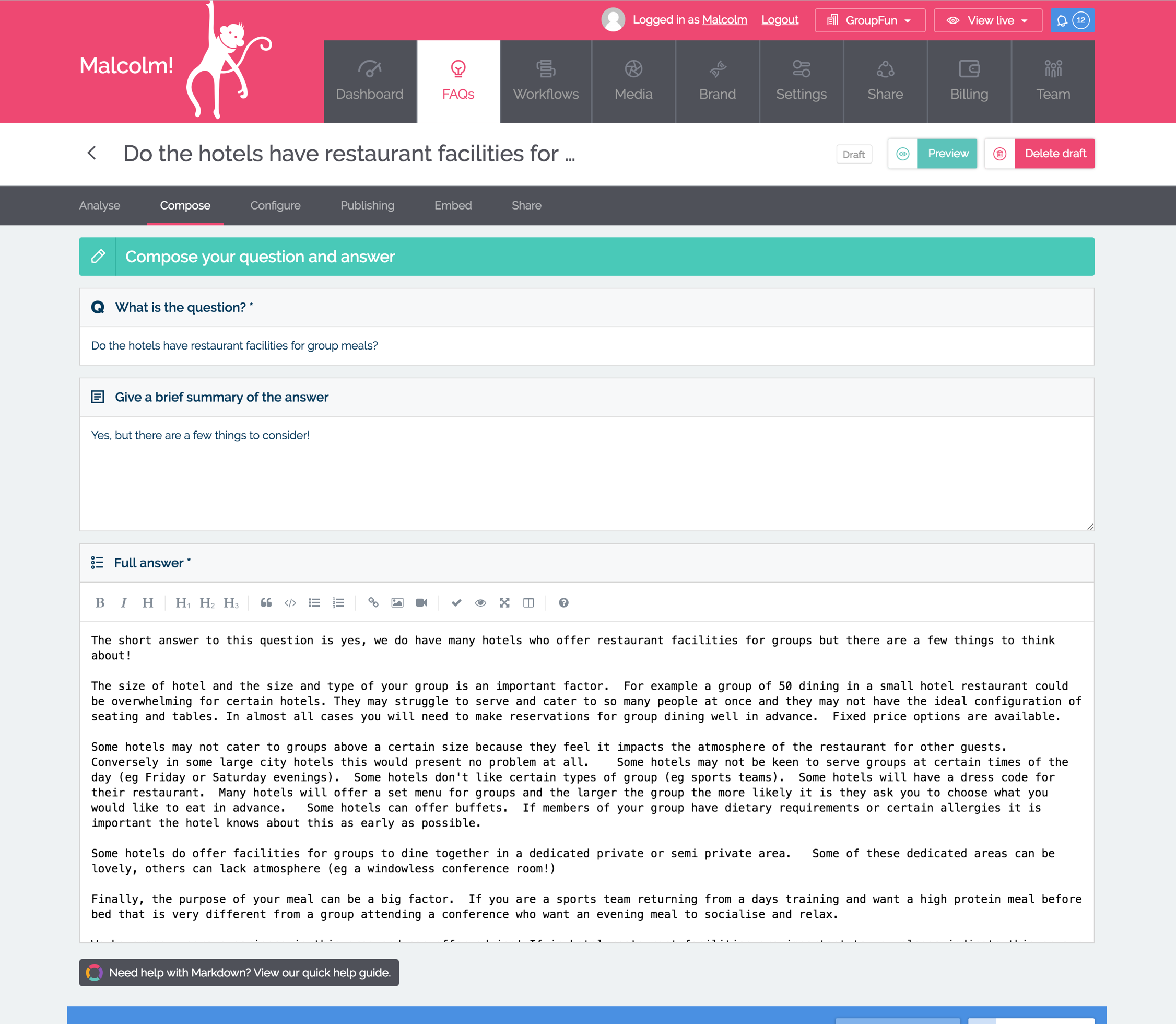 Our Markdown editor makes it easy to compose FAQ content