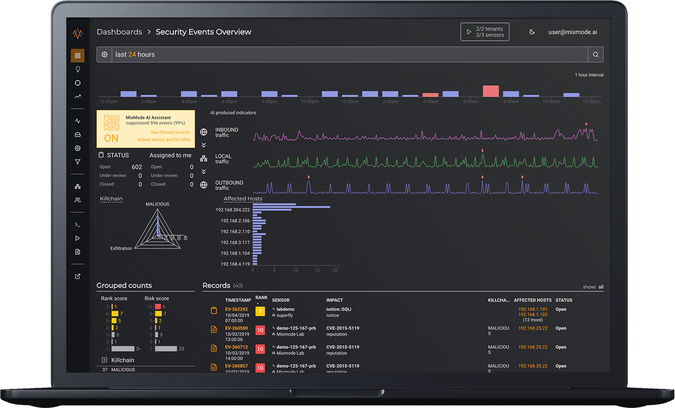 MixMode è una piattaforma di rilevamento delle anomalie nella cybersecurity che combina le funzionalità di SIEM, NDR, NTA e UEBA in un'unica piattaforma progettata appositamente per il SOC moderno. MixMode è focalizzata sulla risoluzione di tre problemi principali per il Centro Operativo di Sicurezza: fornire rilevamento di minacce e anomalie di nuova generazione, far emergere attacchi zero-day e migliorare l'affaticamento da falsi positivi negli avvisi. MixMode consente ai team di sicurezza di aumentare drasticamente la produttività e l'efficienza riducendo significativamente il tempo, lo sforzo e le risorse sprecate associati agli strumenti di cybersecurity legacy.