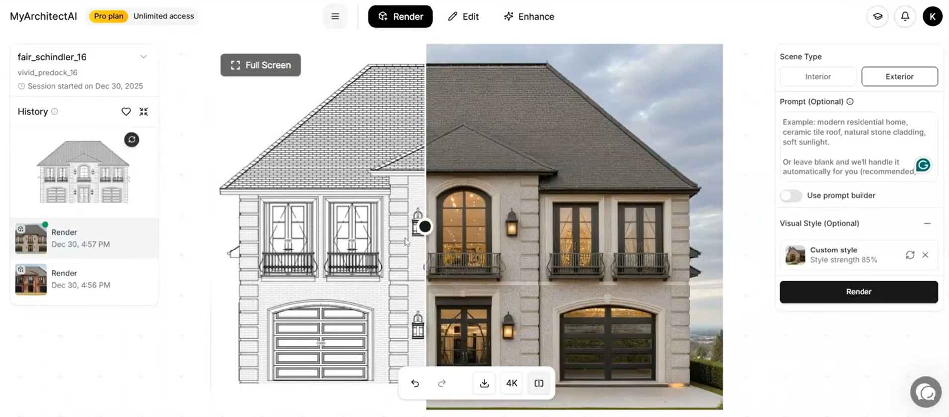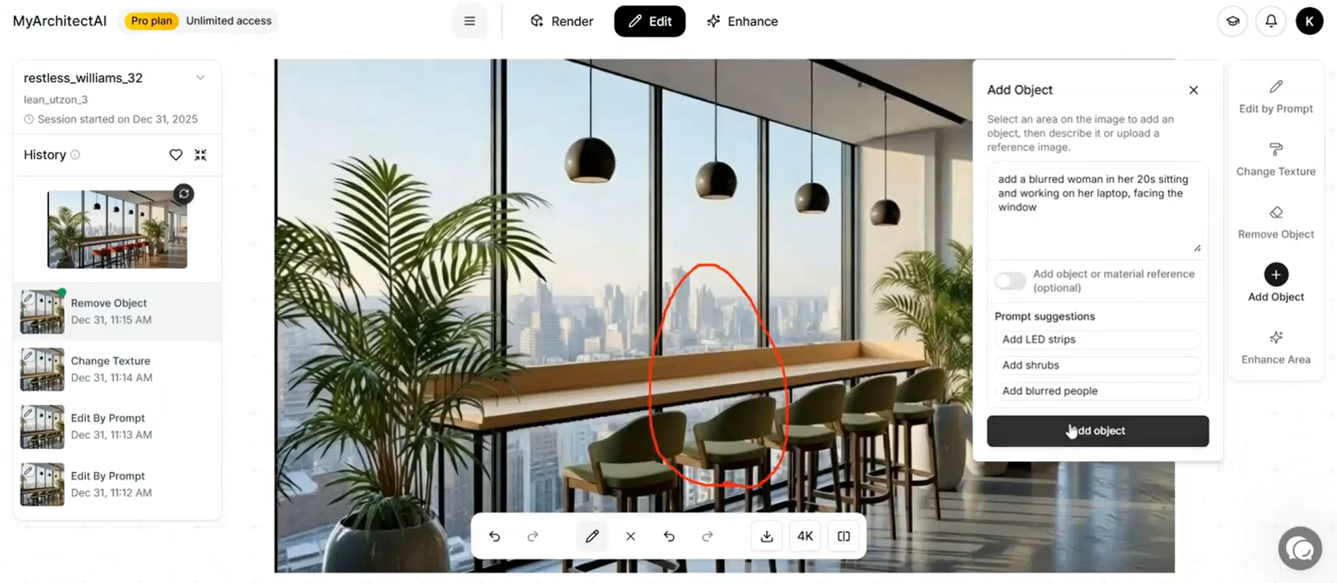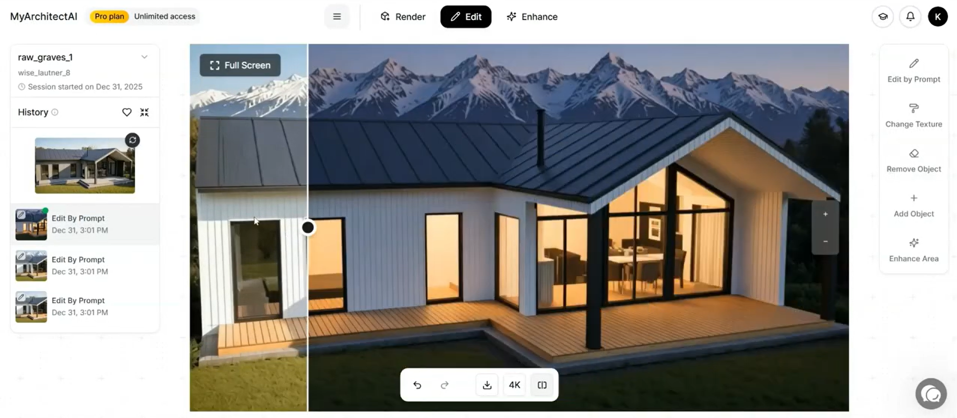 Quello che mi piace di più di MyArchitectAI è la rapidità con cui mi aiuta a passare da un'idea grezza a un concetto visivo chiaro. Devo menzionare che la funzione di rimozione è perfetta, forse la migliore che abbia mai visto.
