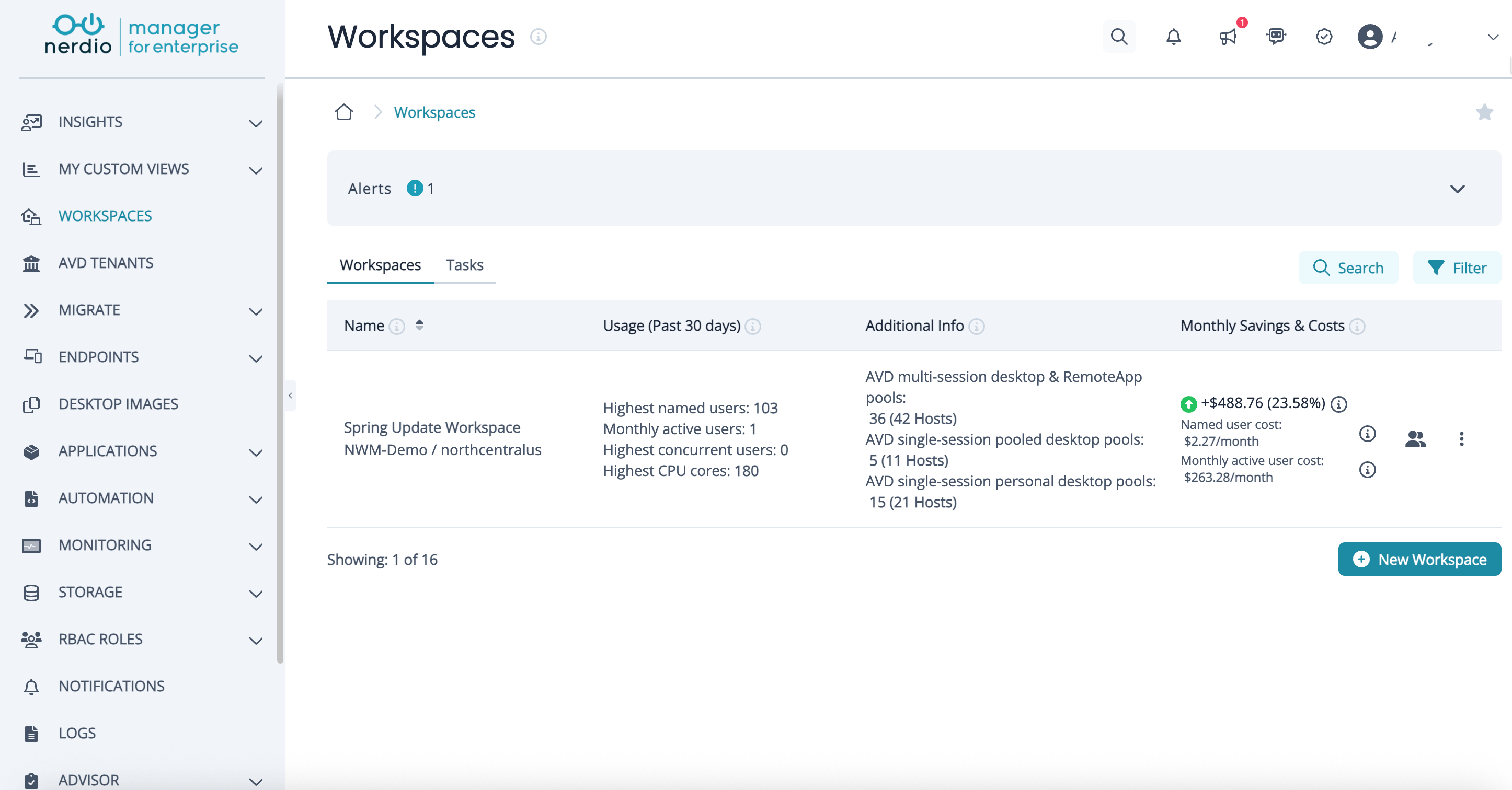 Grandi risparmi generati quando vengono configurate risorse di tipo non 24x7. Un'unica interfaccia per visualizzare più ambienti Azure che utilizzano pool di host, file di Azure, server e networking.