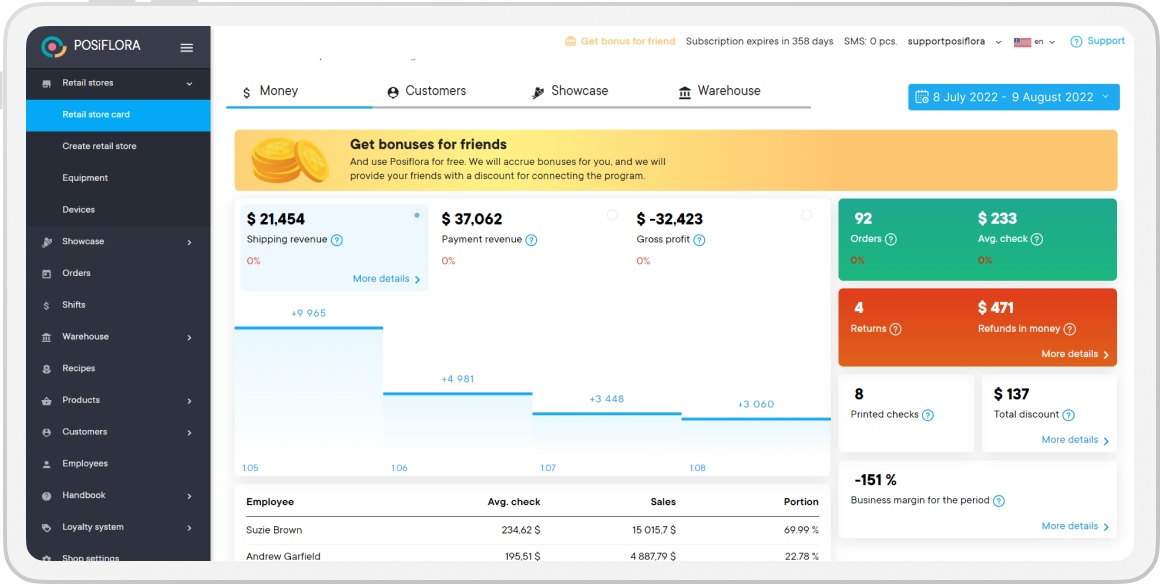 Hana POS aiuta a gestire un negozio di fiori con uno schermo per gli ordini facilmente gestibile, uno schermo per i clienti, una panoramica delle spedizioni e uno schermo per l'itinerario dei conducenti.
