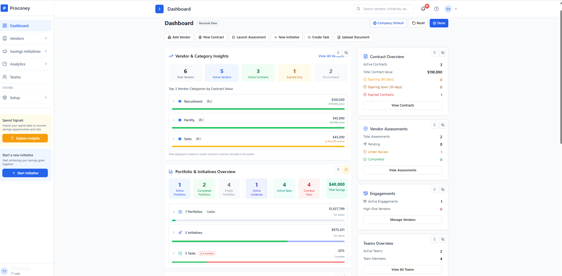 Proconey è progettato per essere nativo per l'approvvigionamento e focalizzato sull'esecuzione. L'obiettivo non è sostituire i sistemi ERP o P2P, ma fornire un livello operativo strutturato che migliori la visibilità, la proprietà, la supervisione del rischio e il follow-through tra fornitori, contratti e iniziative di risparmio.