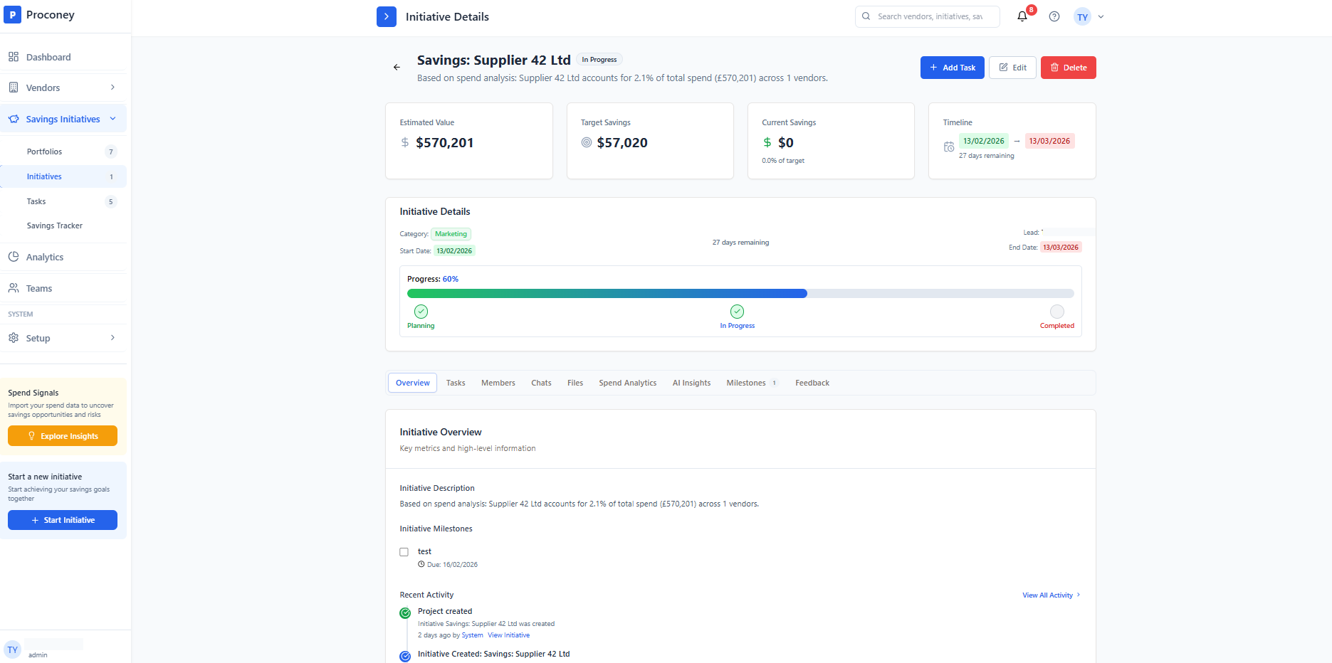Proconey affronta questa lacuna centralizzando il livello operativo della gestione dei fornitori e della consegna dei risparmi. Collega la supervisione dei fornitori e dei contratti con la gestione strutturata delle iniziative, il monitoraggio dell'impegno dei fornitori, la gestione del rischio e il monitoraggio delle prestazioni dei risparmi, consentendo ai team di approvvigionamento e finanza di operare con chiara responsabilità e visibilità condivisa.