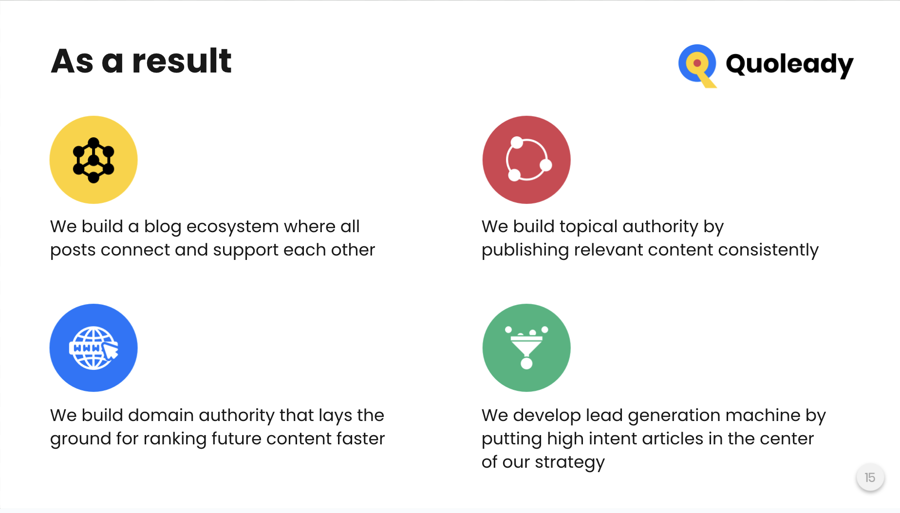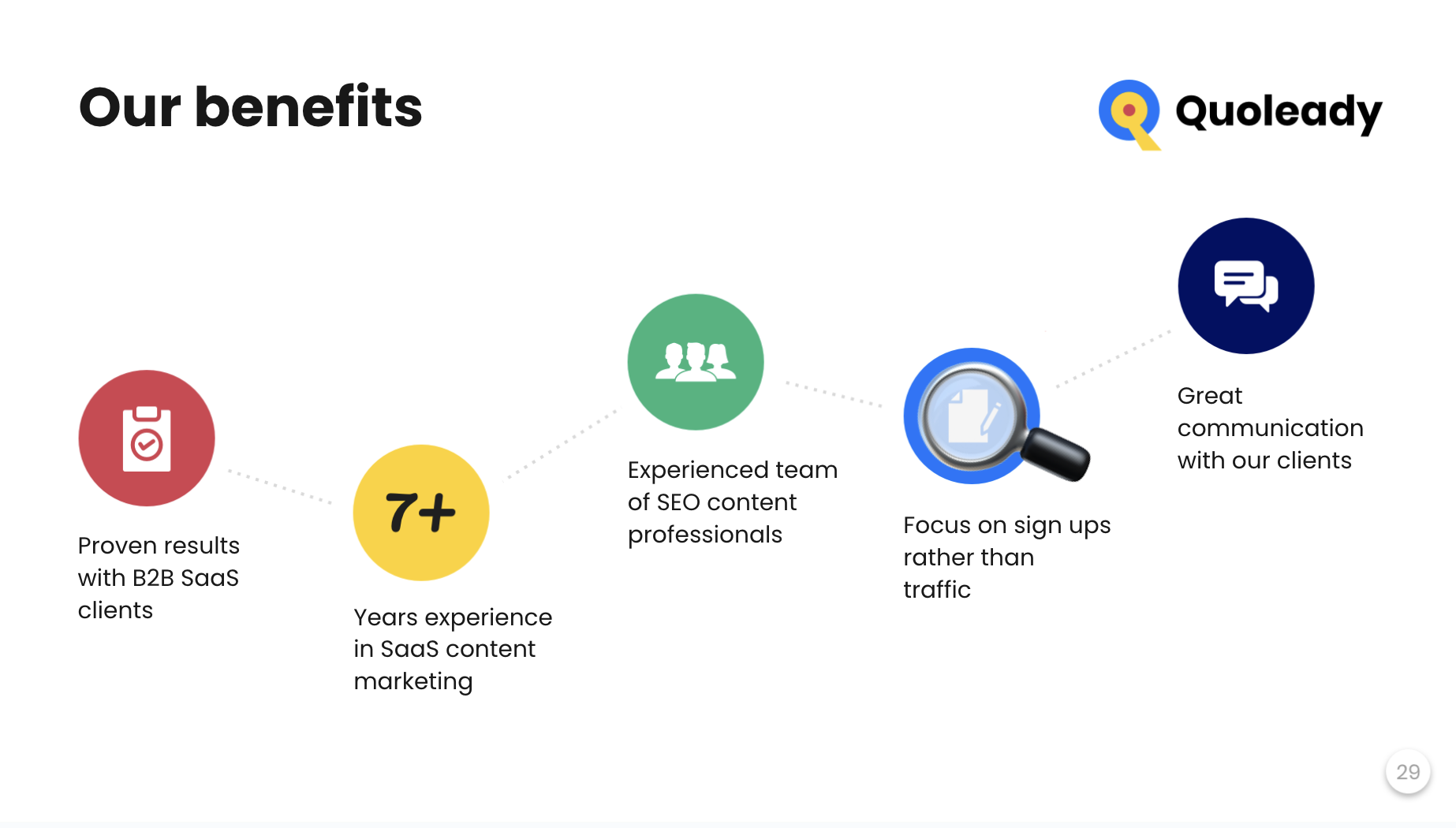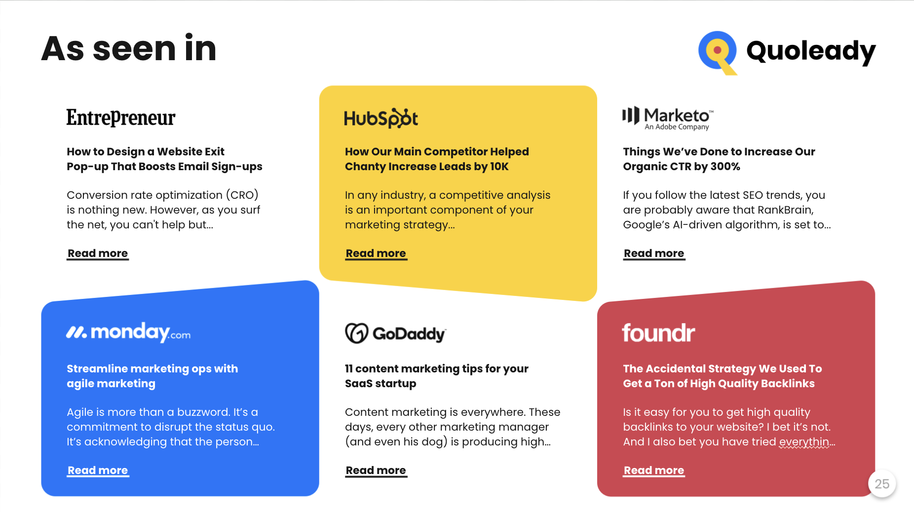 Quello che mi piace di più di Quoleady è la loro affidabilità e comunicazione. Sono super organizzati, rispettano sempre le scadenze e ci tengono aggiornati ad ogni passo. Apprezzo anche la qualità dei backlink: riescono costantemente a ottenere posizionamenti su siti pertinenti e affidabili che effettivamente fanno la differenza per il nostro SEO. Sembra davvero che facciano parte del nostro team, non solo un fornitore esterno. Recensione raccolta e ospitata su G2.com.