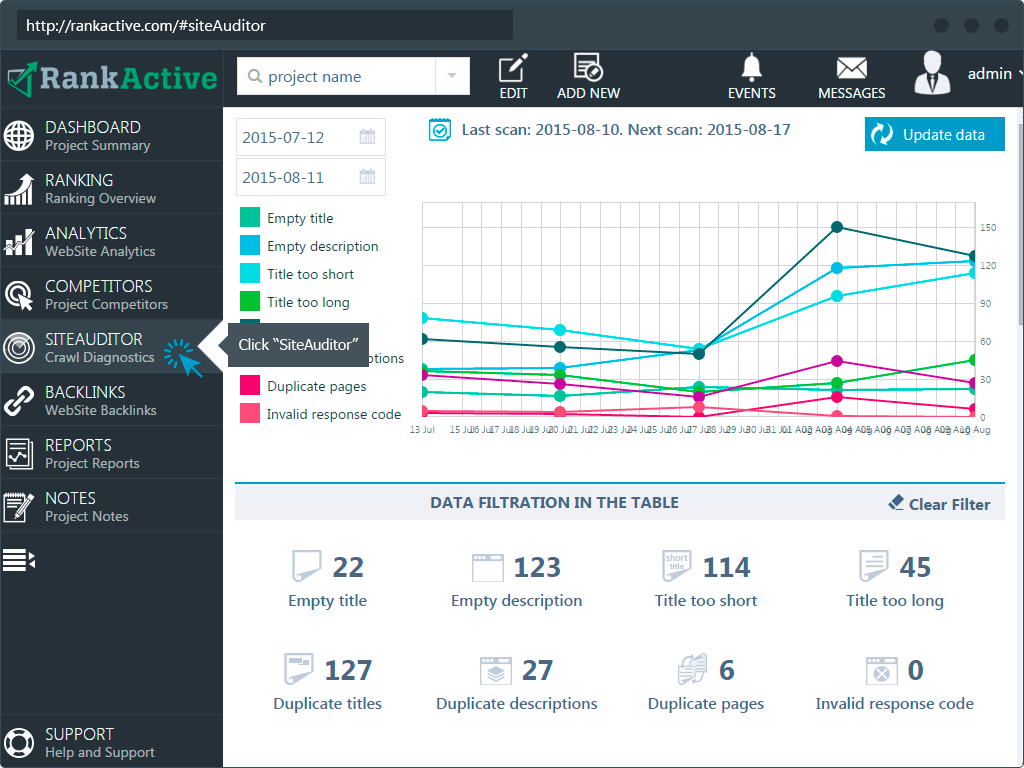 RankActive viene fornito con uno spazio di lavoro on-page ordinato e già con la sua tariffa "Optimal" offre una profondità di scansione di 15.000 - per progetto. Se utilizzi il contratto al massimo puoi scansionare fino a 375.000 pagine tutte le volte che vuoi. Gli strumenti onepage forniti sono perfettamente adeguati per tutte le analisi comuni.