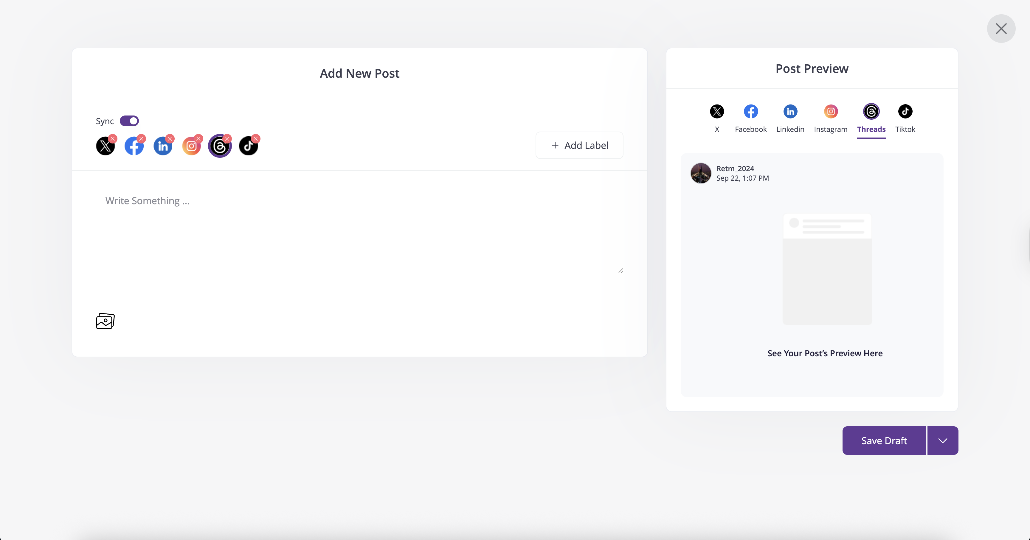 Create and preview social media posts across multiple platforms in a single interface. Users can customize content per channel by toggling sync on or off—for example, publishing a PDF exclusively on LinkedIn, posting a thread on X, or adapting content for Facebook Stories. This feature streamline...