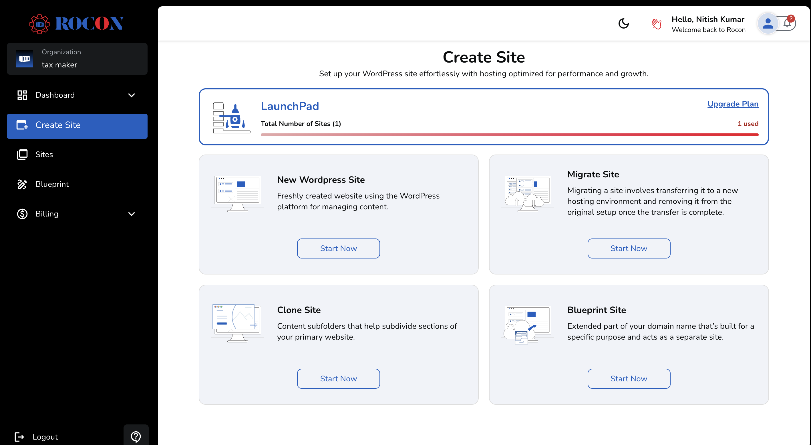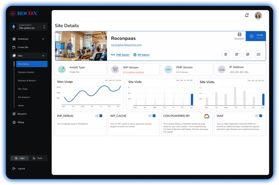 Il nostro dashboard Rocon facile da usare offre un hub centrale per gestire i tuoi siti WordPress. Gestisci facilmente le attività di gestione del sito, gli ambienti di staging, la clonazione e le impostazioni DNS da un'unica interfaccia intuitiva.