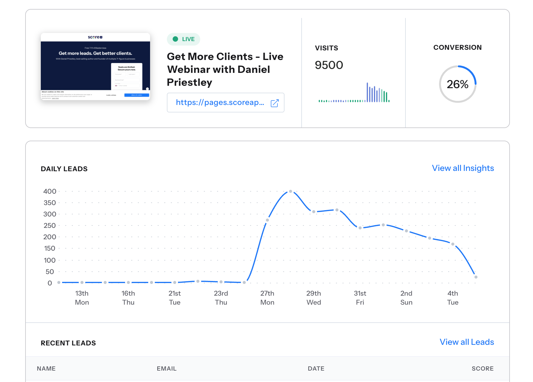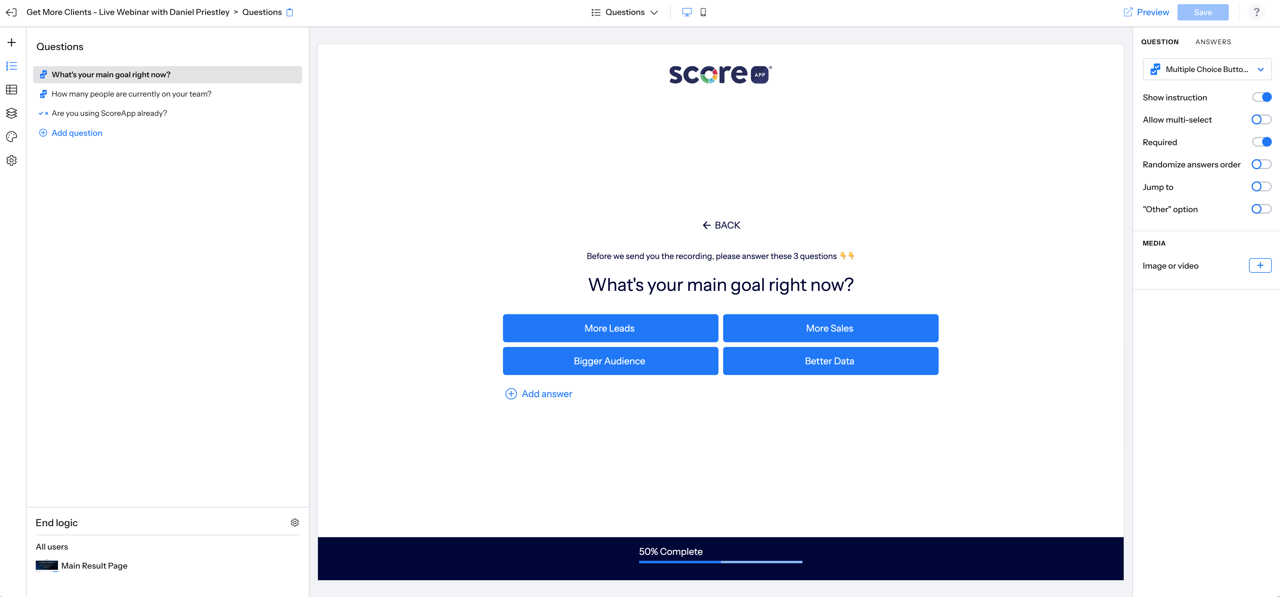 Facile da usare. Una volta configurato, continua a generare contatti in modo costante. Il team di assistenza di ScoreApp è ottimo nell'aiutarti a risolvere eventuali piccole modifiche di cui potresti aver bisogno. Recensione raccolta e ospitata su G2.com.