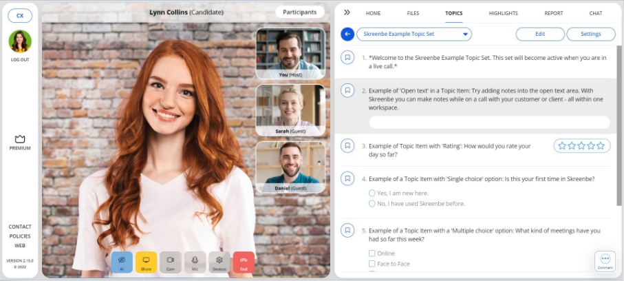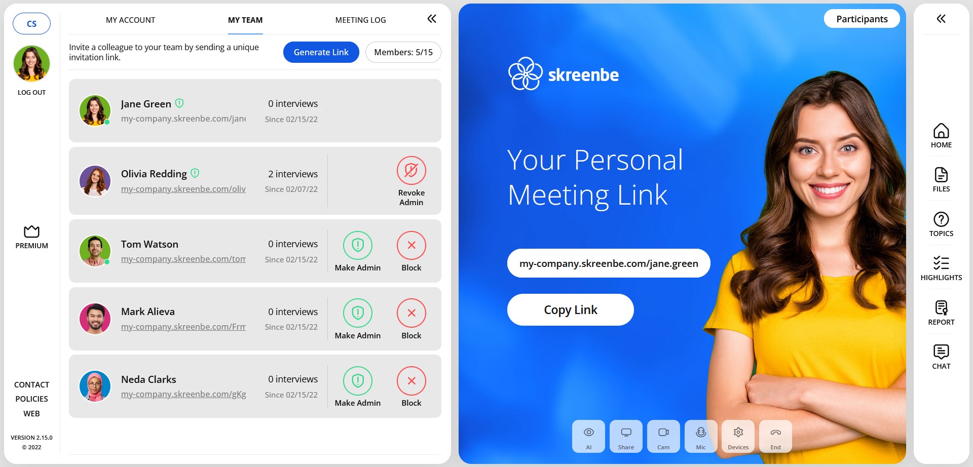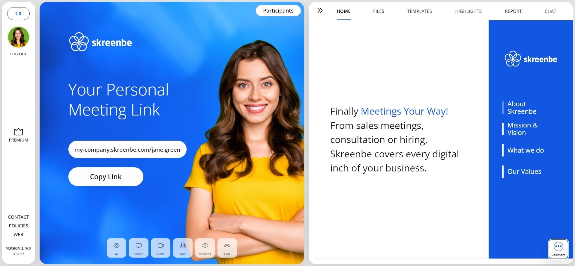 Skreenbe alloSkreenbe è un ottimo strumento per riunioni online. Lavorando nel campo delle risorse umane, utilizzo Skreenbe per intervistare i candidati. È stato facile da usare fin dal primo giorno - nessun download, nessuna implementazione lunga. C'è stata una configurazione rapida - abbiamo nominato il nostro dominio e caricato il logo e l'immagine della nostra azienda - e siamo stati pronti per le nostre interviste.