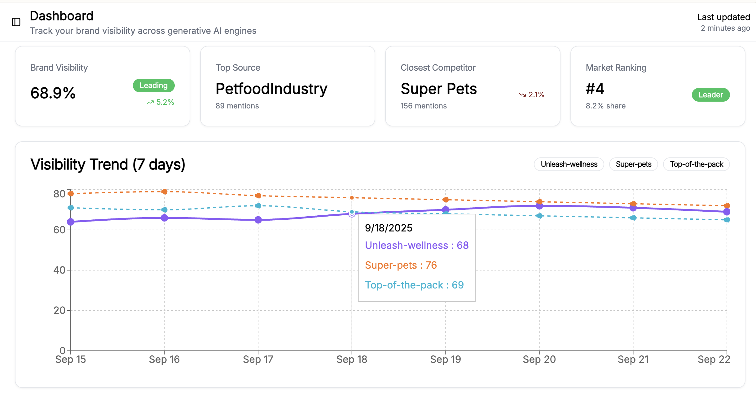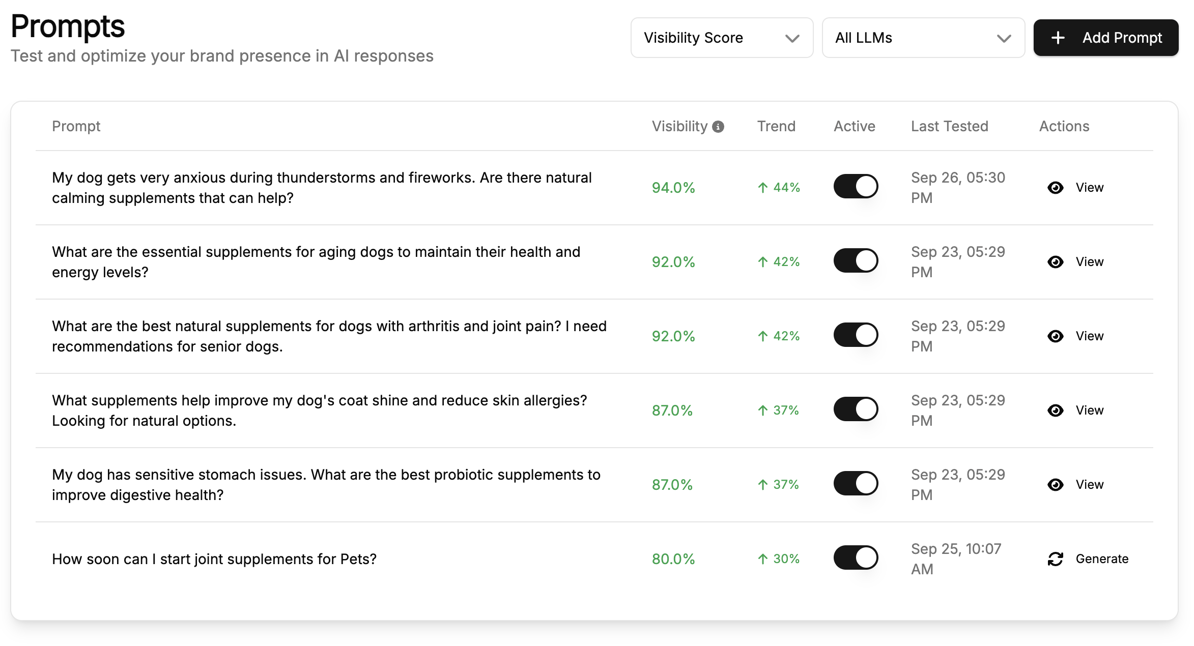 Writesonic è la piattaforma GEO/AEO completa che traccia la visibilità di ricerca AI del tuo marchio, identifica dove i concorrenti ti superano ed esegue le correzioni—creando nuovi contenuti, aggiornando le pagine esistenti, ottenendo citazioni e interagendo su Reddit.