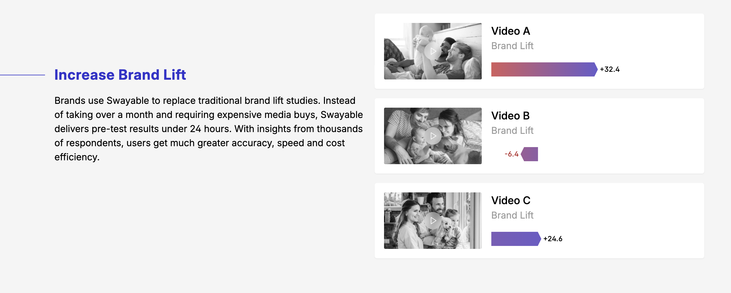 Brands use Swayable to replace traditional brand lift studies. Instead of taking over a month and requiring expensive media buys, Swayable delivers pre-test results under 24 hours. With insights from thousands of respondents, users get much greater accuracy, speed and cost efficiency.