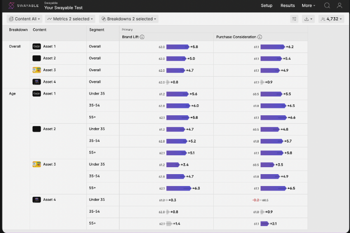 Agencies and brands use Swayable to identify the right concepts and segments based on metrics that correspond to the actual goals of a campaign — not just views, clicks and likes. Swayable proves what actually drives business and campaign outcomes.